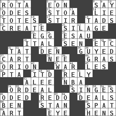 ACROSS 1. Round or rotation of duties 5. Period of immesurable duration 8. Declare 11. Lyric poems 12. Portico 14. Untruth 15. Lugs 17. Commotion 18. Small boys 19. Cause to be 21. Fodder prepared in a silo 23. Oval reproductive body of a fowl 25. Son of Isaac 26. Slanted text style (abbr.) 27. Elected rep. 28. And so on (abbr.) 31. Make lace 33. Lair 35. Mocked 37. Draw slowly or heavily 38. Born 40. Pate de foie ____ 41. Constellation of myth 43. Armed conflict 45. French article 46. Parent Teacher Assoc. 47. It would 50. Have confidence or faith in 52. Toward shelter 53. Basketball assoc. 54. Severe or trying experience 56. Scorches 61. Wrote a lyric poem 62. Make new 65. Allots cards 66. Benjamin's nick name 67. Comedian Laurel of Laurel & Hardy 68. Petty quarrel 69. Tate display 70. Sight organ 71. Coop moms DOWN 1. College mil. group 2. Aroma 3. Wig 4. At sea 5. Double-curved letter 6. Baseball player Mel 7. Annoying sounds 8. Volcanic refuse 9. Helper 10. Affirmative reply 13. Get up 16. Proofreading order 18. The 19th letter of the Greek alphabet 20. Mild oath 22. Long (Scottish) 24. Small, secluded valley 26. "Tell ____ the Marines!" 28. Jane of fiction 29. Afternoon social gatherings 30. Music discs 31. Small pie 32. Operatic vocal solo 34. ___ Haven, CT 36. Unsightly 37. Police officer (slang) 39. Merit 42. Mediterranean tributary 44. Confederate soldiers (slang) 48. Pulls apart 49. Erase 51. Put down 52. Say or write further 54. Baltic tributary 55. Monthly bill 57. Delicate 58. Open wide 59. Liveliness 60. Fast planes 61. Chief or king in Benin or Nigeria 63. 24 hours 64. Single