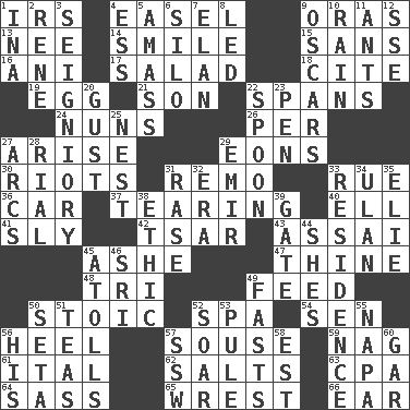 ACROSS 1. Big collection agency 4. Artist's stand 9. Mouths or openings 13. Born 14. Grin 15. Without 16. Cuckoo 17. Vegetable dish 18. Quote 19. Oval reproductive body of a fowl 21. Boy, to dad 22. Connects, as a bridge 24. Religious women 26. For each 27. Get up 29. Immeasurably long periods of time 30. Disturbances 31. San ____ (Riviera town) 33. Sorrow 36. Auto 37. Separating forcefully 40. Pipe bend 41. Roguish 42. Russian ruler of old 43. Slender Brazilian palm 45. American tennis player Robert 47. One or ones belonging to thee 48. Three (prefix) 49. Nourish 50. Unemotional 52. Health resort 54. Elected rep. 56. Person who is morally reprehensible 57. Boozer 59. Tired old horse 61. Slanted text style (abbr.) 62. Table seasonings 63. Tax preparer (abbr.) 64. Backtalk 65. Take or capture by force 66. Hearing organ DOWN 1. _ tizzy (2 wds.) 2. French philosopher Descartes 3. Signiory (variant) 4. Double-curved letter 5. Collect or gather 6. Grain storage tower 7. Liveliness 8. Directed 9. Motion picture awards 10. Water falling in drops from the sky 11. Pismires 12. Compass dir. 20. Abrupt rush of wind 22. Soup utensil 23. Animal enclosure 25. Egg locale 27. Arches 28. Monetary unit of Yemen 29. Arab leader 31. Raze (variant) 32. Epoch 33. Home 34. ____ Bator, Mongolia 35. Writer Wiesel 38. Value system 39. Yard entry 44. "______ My Girl" (Turtles hit) 45. Ringlike coral islands and reefs 46. Indian title of respect (Mr.) 49. Goes without food and/or water 50. Bristle 51. Beverages made from leaves 52. Fly high 53. Whimper 55. California wine valley 56. Part of HMS, perhaps 57. Compass dir. 58. Eastern Standard Time (abbr.) 60. Slender fish