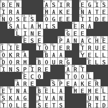 ACROSS 1. Benjamin's nick name 4. SW Saudi Arabia district 8. The front part of a cuirass 12. Retirement account (abbr.) 13. Cause to be 14. Nathan's nickname 15. Olfactory organs 18. Double curve, resembling the letter S 19. Event that recurs at intervals 20. Deli grouping 22. Epoch 23. Actor's bit 24. Turn to the right 25. Compass dir. 26. Flamboyance 30. Falsehood 33. Carrier 36. Loyal 37. Gumbo ingredient 39. Sound made by sheep 40. Shout 41. Dormintory (informal) 42. Town 44. Raised railways 45. Motivate 47. Nonscientific branch of learning 50. Environmental prefix 51. Instrument 53. "We ___ not amused" (Victoria) 54. Orator 57. Inactive volcano in Sicily 59. Actor Lugosi 61. Klaipeda city 63. Heroin 64. _ the terrible 65. University (slang) 66. Lacquered or enameled metalware 67. Puts into a specified state 68. To free from DOWN 1. Storage container 2. Greek god of love 3. Rhinal 4. Mine, in Marseilles 5. Settles 6. Mamie's husband 7. To separate or throw off 8. Plea 9. Greek goddess of the earth (variant) 10. It would 11. Observe 16. Writer Wiesel 17. Without 21. Confront 22. Car or cant ending 24. Slender fish 26. Lightbulb-shaped fruit 27. Algonquian 28. Frame or body of a ship 29. Snakelike fish 30. Farming town in central California 31. Picture 32. Blunders 34. Mitch Miller's instrument 35. The 19th letter of the Greek alphabet 38. Electrical Measurement 42. Sis' sibling 43. Yard entry 46. Frozen water 48. Wander 49. Casino tip 52. Arboreal primate 53. Of or related to the anus 54. Narrow board 55. Zero-star reviews 56. Painter Guido (1575-1642) 57. Eastern Standard Time (abbr.) 58. Ring climax 59. Again 60. Night before a holiday 62. Flaplike covering
