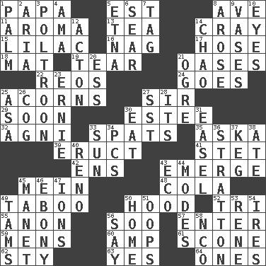 ACROSS 1. Dad 5. Eastern Standard Time (abbr.) 8. "___ Maria" 11. Odor 13. Afternoon social gathering 14. Supercomputer manufacturer 15. Pale purple color 16. Tired old horse 17. Stockings 18. Floor protector 19. Separate forcefully 21. Fertile tracts in a desert 22. Vintage cars 24. Leaves 25. Oak nuts 27. Title for a knight 29. Within a short period 30. First name in cosmetics 32. Hindu god of fire 33. Arguments over trivial matters 35. "____ silly question..." 39. Spew [out] 41. Proofreading order 42. Followers of ems 43. Develop 45. Chow _ 48. Root beer relative 49. Off limits 50. Parka part 52. Three (prefix) 55. At once, immediately (arch.) 56. "Barney Miller" actor Jack 57. Keyboard key 59. Not women's 60. Electrical Unit 61. Biscuitlike quick bread 62. Filthy place 63. It is so 64. Singles DOWN 1. Inside of hand 2. Roberta Peters solo 3. Coward 4. Wet nurse (var.) 5. Inactive volcano in Sicily 6. Dry up 7. Label 8. Came up 9. Flower holders 10. Snake ____ (dice throw) 12. NE Massachussets city 14. US Secretary of Labor Elaine L. _ 20. Double-curved letter 21. Legendary monster 23. Bert's buddy 25. White ___ sheet 26. Gear tooth 27. Fast jet (abbr.) 28. It is 30. Consume 31. Artist's stand 33. Player for Phoenix 34. Personal Computers (abbr.) 36. Ski resort town in Vermont 37. Barrel 38. Had dinner 40. Western Nevada city 43. Environmental prefix 44. Methods 45. French painter Edouard 46. Dark wood 47. Charged particles 49. Scottish caps 50. Dwelling 51. I made a mistake 53. French philosopher Descartes 54. Angers 56. Declare 58. Non-commissioned officer (abbr.)