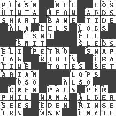 ACROSS 1. Suffix with ecto or cyto 6. Born 9. Greek goddess of the dawn 12. National forest in Provo, Utah 13. Age 14. Does sums 15. Don Adams' spy role 16. Object of repulsion 17. Periodic rise and fall of the sea level 18. According to 19. Snakelike fish 20. Tennis shots 21. Is not 23. Pipe bend 24. In a ____ (agitated or irritated) 25. Bobsleighs 28. Connecticut Ivy Leaguer 30. Stone: prefix 34. Fastener 35. Label 36. Disturbances 38. Period 39. Prong on a fork 41. Hauls 43. Arrange properly for use 44. Believer in; advocate of (suffix) 46. Chops off 48. Bear (Spanish) 49. In addition 50. Group working together 51. Friends 53. For each 56. Silvers or Donahue 57. Nanny 58. Tree or shrub in the Birch family 60. Observes 61. Genesis locale 62. Remove soap 63. Big collection agency 64. Compass dir. 65. Maternal DOWN 1. Tenth month of the Hindu calendar 2. Pale green bean 3. Of or related to the anus 4. Put through a sieve 5. Floor protector 6. Be tempered by heat 7. Immeasurably long periods of time 8. Compass dir. 9. The property of being fit to eat 10. Probability 11. Compass dir. 13. Collude with 14. Ringlike coral islands and reefs 19. Keyboard key 20. French article 22. Small drink 24. Seigniories (variant) 26. Have the gumption 27. Argument over a trivial matter 28. Singer James 29. Den 31. Teat (slang) 32. Friend of Pooh 33. Baseball player Mel 37. Makes a sale 40. Artist's stands 42. Mayday 45. At this time 47. Cotton for raincoats, e.g. 49. ____ Jay Lerner 50. "Mermaids" star 51. Writing tablets 52. Afresh 54. Pulitzer Prize-winning author Ferber 55. Repose 56. Air pressure measure (abbr.) 57. ___ Haven, CT 58. "We ___ not amused" (Victoria) 59. To separate or throw off
