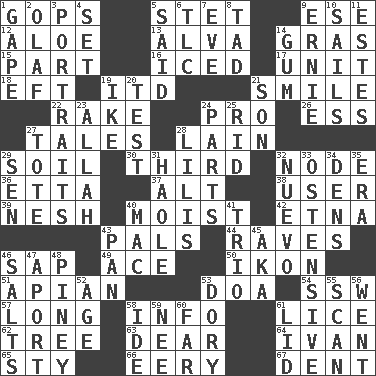 ACROSS 1. Republicans 5. Proofreading order 9. Compass dir. 12. Medicinal plant 13. Inventor's middle name 14. Pate de foie ____ 15. Role in a play 16. On the rocks 17. A single undivided whole 18. Lizard (obsolete) 19. It would 21. Grin 22. Libertine 24. Adept person 26. Curvy letter 27. Lies 28. (Had) reclined 29. Earth 30. One of three equal parts 32. Connecting point 36. Singer James 37. Keyboard modifier key 38. One who makes use of a thing 39. Soft 40. Wet 42. Inactive volcano in Sicily 43. Friends 44. All-night dance parties 46. Plant excrement 49. Adept person 50. Picture 51. Bee-related 53. ___ good deed 54. Compass dir. 57. Yearn 58. A message received and understood 61. Louse (plural) 62. Family _ (genealogy) 63. Letter starter 64. "Terrible" tsar 65. Filthy place 66. Suggestive of the supernatural 67. Gouge DOWN 1. Yawn 2. Norwegian king 3. Likenesses of persons 4. Arrange properly for use 5. Stated 6. Affectionate concern, for short 7. Night before a holiday 8. Small boy 9. Bert's buddy 10. Moves on water 11. _____ Park, CO 14. Chewing product 19. Mamie's husband 20. Trial 21. Male offspring 23. Assad's deity 24. Components 25. To free from 27. Lug 28. Ms. Damita and namesakes 29. Elected rep. 31. White Person, in Hawaii 32. New (sp.) 33. Clearly or manifestly demonstrative 34. Hiding places for outlaws 35. Epoch 40. Big _ 41. Musical group of three 43. Baking dish 45. Alias (abbr.) 46. Table seasonings 47. To the left, to Queeg 48. Abounding in pines 52. Personal question 53. Rowboat 55. Glance over 56. Gone 58. Binary compound 59. Born 60. At a great distance 61. Hat (slang)