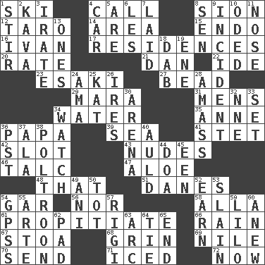 ACROSS 1. What Jean-Claude Killy likes to do 4. Give a ring to 8. The Jewish people; Israel 12. Pacific island yam 14. Type of rug 15. Inside; within (prefix) 16. "Terrible" tsar 17. Homes 20. Pace 21. Daniel's nick name 22. Binary compound 23. 1973 Nobel Price Winner (Physics) Leo 27. Necklace unit 29. Hindu Mythology: god of death 31. Not women's 34. Wetness 35. Queen of England 1702-14 36. Dad 39. Ocean 41. Proofreading order 42. Position in a hierarchy or organization 43. Unadorned figures 46. Baby powder 47. Medicinal plant 48. Not this but _ 51. Natives or inhabitants of Denmark 54. Slender fish 56. And not 58. Silent film actress Nazimova 61. Conciliate 66. Water falling in drops from the sky 67. Portico 68. Smile widely 69. Mediterranean tributary 70. Transmit 71. On the rocks 72. Immediately DOWN 1. Move through with a circular motion 2. Polynesian shrub of the pepper family 3. Feeling or showing extreme anger 4. 4-wheeled motor vehicle 5. "We ___ not amused" (Victoria) 6. French article 7. Put down 8. Elected rep. 9. Event 10. Wrote a lyric poem 11. Olfactory organ 13. Washington bills 18. Apply (a substance) by light strokes 19. Compass dir. 24. Nursemaid (var.) 25. Krazy ___ of comics 26. Angers 28. Collect or gather 30. Sports stadium 32. Compass dir. 33. Put into a specified state 34. Observe 36. Pacific Standard Time (abbr.) 37. Insect wing 38. Characterized by complete cowardliness 40. Old (Scot.) 44. ___ good deed 45. Car or cant ending 49. Black tropical American cuckoo 50. Small child 52. Merit 53. Killed 54. Global Positioning Systems (abbr.) 55. Johnson of "Laugh-In" 57. Swiss mountan, "Queen of the Mountains" 59. _ and Stitch 60. Afresh 62. Groovy apt. 63. Curve 64. Neckwear 65. Conclusion