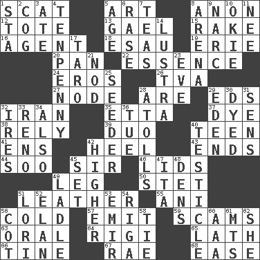 ACROSS 1. Jazz singing style 5. Nonscientific branch of learning 8. At once, immediately (arch.) 12. Haul 13. Highlander 15. Libertine 16. Representative 18. Son of Isaac 19. 4th largest of the Great Lakes 20. Baking dish 22. Gist 24. Greek god of love 26. Federal power corp. 27. Thickened enlargement 28. "We ___ not amused" (Victoria) 29. Begley and Asner 32. SW Asia republic 35. Singer James 37. Color 38. Have confidence or faith in 39. Superhero pair 40. Adolescent 41. Followers of ems 42. Person who is morally reprehensible 43. Extremities 44. "Barney Miller" actor Jack 45. Title for a knight 46. Hats (slang) 49. Part of a journey 50. Proofreading order 51. Cordwainer's material 55. Black tropical American cuckoo 56. Lacking warmth 57. Send forth 59. Fraudulent business schemes 63. Spoken 64. Swiss mountan, "Queen of the Mountains" 65. Thin strip of wood or metal 66. Prong on a fork 67. Actress Charlotte 68. Comfort DOWN 1. R.R. building 2. Gear tooth 3. Had dinner 4. 3-inch nail 5. Ripen 6. Raze (variant) 7. Beverages made from leaves 8. Sports stadium 9. Drug cop 10. Migrant worker of the '30s 11. Born 14. A period of five years 17. Edible starchy tuberous root 21. Allow head to fall sleepily 23. Night before a holiday 25. Sowing specialist 28. Ringlike coral islands and reefs 29. Locale of original sin 30. Colored 31. Elected reps. 32. Angers 33. Former U.S. Attorney General Janet 34. In addition 36. Third day of the wk. 40. A testis 42. Having greater elevation 45. Arrange properly for use 47. Call ___ day 48. Habitations of wild animals 49. Dipping utensil 51. Australian parrot (variant) 52. Enthusiasm 53. Independent ruler or chieftain 54. Capital of Latvia 56. Small bed 58. Neckwear 60. Auto club (abbr.) 61. Mountains (abbr.) 62. A female animal or person