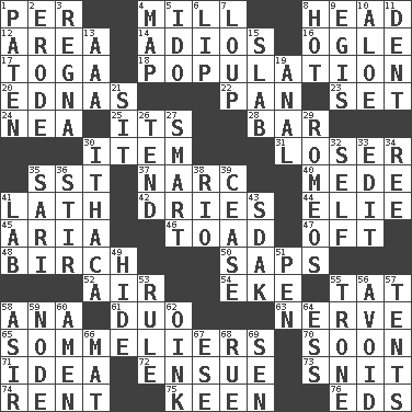 ACROSS 1. For each 4. Place where flour is made 8. Froth on beer 12. Type of rug 14. Goodbye (Sp.) 16. Stare 17. Ancient Roman robe 18. Census information 20. Ferber et al. 22. Baking dish 23. Arrange properly for use 24. Teachers' org. 25. ___ a Wonderful Life 28. Oblong piece of solid material 30. A distinct part 31. Failure 35. Fast jet (abbr.) 37. Drug cop 40. Ancient Persian 41. Thin strip of wood or metal 42. Frees from moisture 44. Writer Wiesel 45. Roberta Peters solo 46. Frog relative 47. Often (poetically) 48. A tree used for making furniture 50. Plant excrements 52. Wind 54. Make supply last 55. Make lace 58. Santa ___, CA 61. Superhero pair 63. Boldness 65. Wine waiters 70. Within a short period 71. The main thing one is thinking about 72. Follow as a consequence or result 73. In a ____ (agitated or irritated) 74. Monthly bill 75. Peachy ____! 76. Begley and Asner DOWN 1. Eucharist need 2. Wear away 3. Rain (Swedish) 4. Atlas unit 5. Wedding promise 6. Mouth edge 7. Central Nebraska county 8. Being at a high temperature 9. Armor plate that protects the chest 10. _ vera 11. Scratch 13. American Automobile Association (abbr.) 15. Broad, flat, thick piece 19. Of or related to the anus 21. Be seated 26. Look after 27. Don Adams' spy role 29. Lover boys 30. New York city 32. Oneself 33. Prepare for publication 34. To sift 35. Indian skirt 36. Use a swizzle stick 38. River (Sp.) 39. Desist 41. Experiment locale 43. Neighbor of Neb. 49. Flintstone garb 51. Animal enclosure 53. General guideline 55. Heavy duty weighing machine 56. Shun 57. Portable shelters 58. SW Saudi Arabia district 59. Thickened enlargement 60. So be it 62. Pig sound 64. Double-curved letter 66. Floor covering 67. Compass dir. 68. Regret 69. Elected rep.
