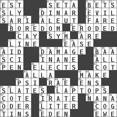ACROSS 1. Eastern Standard Time (abbr.) 4. Bristle 8. Wagers 12. Secret 13. Middle Eastern gold or silver currency 14. Morally bad or wrong 15. Indian skirt 17. Native American of Southwest Alaska 18. Conductor's collection 19. Mood resulting from idleness 21. Eaten away 23. Island 24. Symbol (abbr.) 26. "We ___ not amused" (Victoria) 27. Actor's bit 28. Relaxation 30. Help 31. Break 34. Sound made by sheep 37. _-fi 38. Silly 39. 100% 40. Writing instrument 41. Opts 42. Small bed 43. Silent film actress Nazimova 44. Create 46. 23rd letter of the Greek alphabet 47. Actress Charlotte 50. Followers of ems 51. Chalkboards 54. Portable computers 57. ____ d'Azur (French Riviera) 58. Feeling or showing extreme anger 60. Grandmother 62. River in Europe 63. 61 cubic inches 64. Gear tooth 65. Canisters 66. Locale of original sin 67. She-sheep DOWN 1. Double-curved letter 2. Broad, flat, thick piece 3. Polypeptide antibiotic 4. Grain storage towers 5. Foe 6. The 19th letter of the Greek alphabet 7. Johnson of "Laugh-In" 8. Prior to 9. Dodge 10. Hoop that covers a wheel 11. Downhill vehicle 13. June honoree 16. SW Asia republic 20. Sight organ 22. Raze (variant) 25. Intended 27. Louse (plural) 29. Matures 30. Cleo's killer 31. Deli pickle 32. Approach 33. Big _ 34. Keyboard key 35. Medicinal plant 36. Keyboard modifier key 41. Writer Wiesel 43. Michaelmas daisies 44. Was introduced to 45. Soon (poet.) 46. Eucharist need 48. Having winglike extensions 49. Eroded 51. Highlander 52. Farming town in central California 53. Drop; flow; fall 55. For each 56. Frozen precipitation 59. To free from 61. Ripen