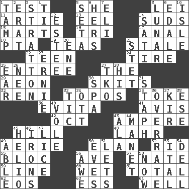 ACROSS 1. Trial 5. A female animal or person 8. Luau accessory 11. Nick name for Arthur 13. Snakelike fish 14. Soap bubbles 15. Shops 16. Three (prefix) 17. Of or related to the anus 18. Parent Teacher Association (abbr.) 19. Afternoon social gatherings 21. Lacking originality or spontaneity 22. Adolescent 24. Become fatigued 25. Main course 27. Definite Article 29. Period of immesurable duration 30. Burlesque acts 32. Painter Guido (1575-1642) 33. Literary convention 35. Puff or smoke 39. Webber/Rice musical 41. Advice 42. Sep. follower 43. Electrical Unit 45. Land elevation 48. Cowardly lion portrayer 49. Nest on high 50. Enthusiasm 52. To free from 55. Coalition 56. "___ Maria" 57. Related on the mother's side 59. Actor's bit 60. Dripping 61. Add up to 62. Greek goddess of the dawn 63. Double-curved letter 64. Water source DOWN 1. Pack (down) 2. Part of Q.E.F. 3. Ski resort town in Vermont 4. Teat (slang) 5. Bristle 6. Possessive pronoun 7. Connecticut Ivy Leaguer 8. Type of eclipse 9. Peak District village in England 10. Capri or Wight 12. First name in cosmetics 14. Suttee (variant) 20. Compass dir. 21. Proofreading order 23. Bert's buddy 25. Hearing organ 26. Born 27. Ring climax 28. Part of HMS, perhaps 30. Health resort 31. Staphylococcus 33. Nervous spasm 34. Baseball player Mel 36. Make much ado about nothing 37. Apertif with cassis 38. Compass dir. 40. Grand slam 43. According to 44. French painter Edouard 45. Sun: prefix 46. Metal shackles 47. Louse (plural) 49. Competent 50. Nights before holidays 51. Allows 53. Slanted text style (abbr.) 54. Small valley 56. Deep reverence 58. At this time