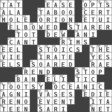 ACROSS 1. Make lace 4. Relaxation 8. Chooses 12. Chicken ___ king 13. Off limits 14. Sure thing 15. Undercover agent 17. Constellation of myth 18. Needle holder 19. Shoved, as through a crowd 21. A viewer who gazes fixedly 23. Small child 24. Morning condensation 26. Black tropical American cuckoo 27. Patter 28. Basketball hoops 30. Snakelike fish 31. Unemotional ones 34. Definite Article 37. Compete 38. Feeling or showing extreme anger 39. Consenting reply 40. Raised railways 41. Flew 42. Actress Charlotte 43. Tear apart 44. Constrict 46. Forbid 47. Connecticut Ivy Leaguer 50. Nervous spasm 51. Tootsie (variant) 54. Pertaining to the sea 57. Hindu god of fire 58. Flower holders 60. Singer Brickell 62. Western Nevada city 63. Happening 64. Call ___ day 65. Adolescent 66. Indian skirt 67. Fish or hair follower DOWN 1. Scottish cap 2. _ vera 3. Baron Munchausen's specialties 4. Having ears or earlike features 5. Tolerate 6. "Barney Miller" actor Jack 7. Immeasurably long periods of time 8. Seas 9. _ dish (used to culture cells) 10. Loyal 11. Disorderly outburst 13. Pull behind 16. Inky black, to poets 20. Baseball player Mel 22. Scottish caps 25. Compose 27. To provide with a ceiling 29. On the rocks 30. First lady 31. The Jewish people; Israel 32. Exchange 33. Boat paddle 34. Polypeptide antibiotic 35. Pile 36. Compass dir. 41. Elected reps. 43. Food allowance for one day 44. R.R. building 45. Prong on a fork 46. Child's nurse 48. Failure 49. Ancient Celtic tribe of eastern Britain 51. Small pie 52. Double curve, resembling the letter S 53. Jacques Cousteau's middle name 55. Eastern Standard Time (abbr.) 56. Quote 59. Actress Gardner 61. Ingest