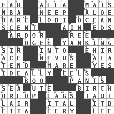ACROSS 1. Ewer handle 4. Silent film actress Nazimova 8. Floor coverings 12. Basketball assoc. 13. Shed a tear 14. _ vera 15. Have the gumption 17. Farming town in central California 18. Sea 19. Aroma 21. Direct toward a target or goal 23. Begley and Asner 24. Zeal 26. To sift 28. Double curve, resembling the letter S 30. Jerking 34. Title for a knight 37. To the inside or interior of 39. Arab leader 40. Adept person 41. Congenital growth or mark on the skin 43. In the manner of 44. Watch over 46. Female horse 47. Consenting reply 48. Under perfect conditions 51. Snakelike fish 54. Oct. 31 cry 55. Leg coverings 58. Ocean 61. Shoshoni 63. A tree used for making furniture 65. Fourth or lowest deck 67. Falls behind 71. "Change" in Tahitian 72. Den 73. Slanted text style (abbr.) 74. It would 75. Singer James 76. Suggestive of the supernatural 77. Area sheltered from the wind DOWN 1. Extremities 2. Phillipine bananalike plant 3. More valued for its uncommonness 4. Leather borer 5. Lion 6. Directed 7. Capital of Western Samoa 8. Apple computer (short form) 9. Toward shelter 10. Frog relative 11. Elected reps. 16. Inside; within (prefix) 18. Presage 20. Coat; cloak 22. Lyricist Gershwin 25. It's straight from the horse's mouth 27. Supplement with great effort 29. Foe 30. You are 31. "If ____ say so..." 32. The longest river in the world 33. Pate de foie ____ 34. Suttee (variant) 35. On the rocks 36. French philosopher Descartes 38. Federal power corp. 42. Ooze 45. Apply (a substance) by light strokes 49. Central Nebraska county 50. Car dealer's back yard 52. Experiment locale 53. In a ____ (agitated or irritated) 56. Hang back 57. Scutum 58. Flatfish 59. Part of Q.E.F. 60. Came down and settled, as after flight 62. Writer Wiesel 64. Flintstone garb 66. Mouth or opening 68. Had dinner 69. Slender fish 70. Stealthy