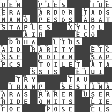 ACROSS 1. Lair 4. Sliced desserts 8. Third day of the wk. 11. Period 12. Zeal 14. Small boys 15. Billionth: prefix 17. Mexican monetary units 18. Blind as ____ 19. Paper fasteners 21. Xylene (variant) 23. Wind 24. Environmental prefix 25. Capital of the state of Qatar 27. Hats (slang) 30. Assist 31. Noteworthy scarcity 34. And so on (abbr.) 37. Compass dir. 38. Pitcher Ryan 39. Plant excrement 40. Personal Computers (abbr.) 41. Bathroom plumbing fixture 43. _ moment's notice (2 wds.) 44. Fast planes 45. Needle case 47. Attempt to accomplish something 49. The 19th letter of the Greek alphabet 50. _____ steamer (cargo ship) 52. French poetic form 56. Ancient river in northeast Turkey 57. More uncommon 60. One who uses or employs something 61. Travel on or in a vehicle 62. Leaves out 63. Whopper 64. Enemy 65. Airs 66. Raised railways DOWN 1. Habitations of wild animals 2. Part of Q.E.F. 3. Nanny 4. Some stationery 5. Angers 6. Begley and Asner 7. "Barney Miller" actor Jack 8. Off limits 9. Freehold land 10. Eastern Standard Time (abbr.) 13. Acura sports coupe 14. Baby powder 16. Brightly colored fish 20. One who doesn't tell the truth 22. It is so 25. Flat circle 26. Lyric poems 27. Ms. Damita and namesakes 28. Slanted text style (abbr.) 29. Unit of force 30. Viper 32. Pismires 33. Carrot, for example 34. Son of Isaac 35. Jacques of French films 36. Numbers guy (abbr.) 42. Beverages made from leaves 44. Symbol (abbr.) 46. Ballerina skirt 47. Buy and sell 48. To erase 49. Laconic 50. Musical group of three 51. Adept person 52. Puts into a specified state 53. Small island 54. Famous astronaut Armstrong 55. Ancient Greek god of war 56. Sandy's bark 58. Electrical Unit 59. River (Sp.)
