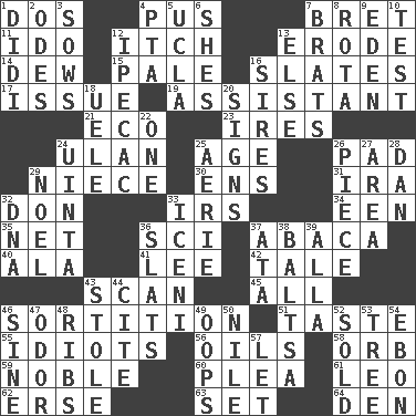 ACROSS 1. Two (Sp.) 4. Ichor 7. Cy Young winner Saberhagen 11. Wedding promise 12. Hankering 13. Eat (away) 14. Morning condensation 15. Diluted with white 16. Chalkboards 17. Come out of 19. Aide 21. Environmental prefix 23. Angers 24. Uhlan (variant) 25. Personal question 26. Writing tablet 29. Sibling's daughter 30. Followers of ems 31. Lyricist Gershwin 32. Spanish title 33. Big collection agency 34. Car or cant ending 35. Fish or hair follower 36. _-fi 37. Phillipine bananalike plant 40. According to 41. Area sheltered from the wind 42. Story 43. Examine hastily 45. Everything 46. Drawing lots 51. Clothes sense 55. Foolish or stupid persons 56. Lubricates 58. Globe 59. Having high moral qualities 60. Entreaty 61. Lion 62. Celtic language 63. Put into a specified state 64. Lair DOWN 1. "You Light Up My Life" star Conn 2. Lyric poems 3. Sty mamas 4. Parent Teacher Assoc. 5. Southern CA. univ. 6. "______ My Girl" (Turtles hit) 7. Naughty children 8. Round or rotation of duties 9. Locale of original sin 10. Trial 12. Medicinal drug used to evoke vomiting 13. Otherwise 16. Founders of families 18. Ubangi River tributary 20. Public displays of written messages 22. Single 24. National forest in Provo, Utah 25. Nest on high 26. Component 27. Type of rug 28. Daniel's nick name 29. Christmas carol 32. Heredity factor (abbr.) 33. Ancient Celtic tribe of eastern Britain 36. Narrow boards 37. "One Day ___ Time" 38. Greek mezzo-soprano Agnes 39. Silent film actress Nazimova 43. Fur scarf 44. Quote 46. Trig term 47. Aroma 48. Chest bones 49. I made a mistake 50. The longest river in the world 52. Disposed of to a purchaser 53. Family _ (genealogy) 54. Inky black, to poets 57. Allow