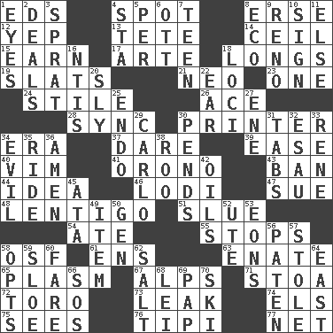 ACROSS 1. Begley and Asner 4. Specific locale 8. Celtic language 12. Slangy assent 13. Wig 14. To provide with a ceiling 15. Merit 17. Johnson of "Laugh-In" 18. Yearns 19. Narrow boards 21. Modern: prefix 23. Single 24. Vertical member of a panel or frame 26. Adept person 28. Synchronize (abbr.) 30. Hard copy producer 34. Epoch 37. Have the gumption 39. Comfort 40. Zeal 41. U. of Maine site 43. Forbid 44. The content of cognition 46. Farming town in central California 47. Take to court 48. Small, flat, pigmented spot on the skin 51. Turn sharply 54. Had dinner 55. Ceases 58. Order of Saint Francis (abbr.) 61. Followers of ems 63. Maternal 65. Suffix with ecto or cyto 67. High mountains 71. Portico 72. "Corrida" creature 73. Path through which fluid escapes 74. Raised railways 75. Perceives with the eye 76. Native american tent (variation) 77. Fish or hair follower DOWN 1. Sight organs 2. Allots cards 3. Small fatty European fish 4. R.R. building 5. For each 6. Baseball player Mel 7. Adolescent 8. Environmental prefix 9. Former U.S. Attorney General Janet 10. Attach a signature 11. Otherwise 16. Nuclear Threat Initiatives 18. Locales 20. Secret 22. Hearing organ 25. Inside; within (prefix) 27. Compass dir. 29. Monte _, Las Vegas Hotel/Casino 30. Hangs 31. Bar bills 32. Son of Isaac 33. French philosopher Descartes 34. Tending to cause great harm 35. Travel on an animal 36. So be it 38. Friend of Pooh 42. Petroleums 45. _ moment's notice (2 wds.) 49. A whole individual unit 50. Commissioned mil. rank 52. Shoshoni 53. Immeasurably long periods of time 56. Eucharist need 57. Fur scarf 58. Chooses 59. A type of plum 60. Conductor's collection 62. Table seasoning 64. 90 degrees 66. Distress signal 68. Luau accessory 69. Infant food 70. What Jean-Claude Killy likes to do