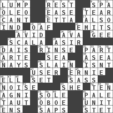 ACROSS 1. Mass 5. Take ten 9. Health resort 12. Margarine 13. Relaxation 14. Pull apart 15. Patter 16. Singer James 17. In addition 18. Indiana (abbr.) 19. Clumsy lout 21. Gives off 22. Enthusiastic 24. Actress Gardner 26. Turn to the right 27. Any of the three canals of the cochlea 28. SW Saudi Arabia district 29. Raised platform 30. Wash lightly 32. Role in a play 36. Johnson of "Laugh-In" 37. Ocean 38. Toward the sea 39. Negative votes 40. Killed 42. Is not 43. One who uses or employs something 44. Bert's buddy 46. Pipe bend 49. Arrange properly for use 50. Backtalk 51. Annoying sound 53. A female animal or person 54. "___ Little Indians" 57. Hindu god of fire 58. Not divided or shared with others 61. Diluted with white 62. Drawn tight 63. Mitch Miller's instrument 64. A single undivided whole 65. Followers of ems 66. Plant excrements 67. Proofreading order DOWN 1. Event scenes 2. Uhlan (variant) 3. Ananias' fault 4. Plant holder 5. Coral ridge 6. Ingest 7. Fast jet (abbr.) 8. Beverage made from leaves 9. Former Milwaukee Brewers owner Bud 10. Thick mixture 11. Came up 14. Scottish cap 19. Petroleum 20. The sixth month of the Jewish calendar 21. Hearing organ 23. Flower holders 24. Slender Brazilian palm 25. Compete 27. "Two Mules for Sister ____" 28. Approach 29. Daniel's nick name 31. Small island 32. Aches 33. Helper 34. French philosopher Descartes 35. Make lace 40. Compass dir. 41. Soft 43. Purpose 45. Actress Charlotte 46. Related on the mother's side 47. Utah city north of Ogden 48. "_ and Lucy" (Charlie Brown theme song) 52. Be seated 53. Perceives with the eye 55. Writer Wiesel 56. Remaining after all deductions 58. Distress signal 59. Chief or king in Benin or Nigeria 60. Trim (branches) 61. Festering