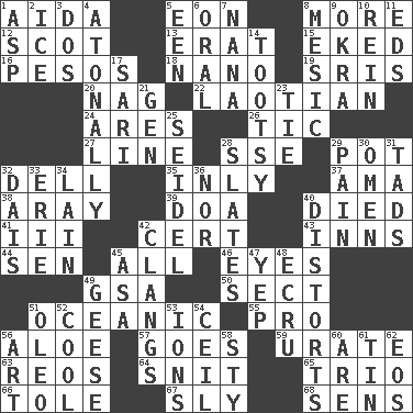 ACROSS 1. Opera by Verdi 5. Period of immesurable duration 8. Greater amount 12. Native of Scotland 13. Part of Q.E.F. 15. Made supply last 16. Mexican monetary units 18. Billionth: prefix 19. Indian titles of respect 20. Tired old horse 22. Of or relating to Laos or its people 24. Ancient Greek god of war 26. Nervous spasm 27. Actor's bit 28. Compass dir. 29. Cooking vessel 32. Small valley 35. Inwardly 37. Nursemaid (var.) 38. Like ___ of sunshine 39. ___ good deed 40. Passed on 41. One more than two 42. Sure thing 43. Restaurants 44. Elected rep. 45. 100% 46. Snake ____ (dice throw) 49. Girls' org. (abbr.) 50. Religious group 51. Pertaining to the sea 55. Adept person 56. _ vera 57. Travels 59. A salt of uric acid 63. Vintage cars 64. In a ____ (agitated or irritated) 65. Musical group of three 66. Lacquered or enameled metalware 67. Roguish 68. Elected reps. DOWN 1. Viper 2. Frozen water 3. Two (Sp.) 4. Without tonality 5. Car or cant ending 6. Taken by mouth 7. Nanny 8. Of or pertaining to a meson 9. Gumbo ingredient 10. It's straight from the horse's mouth 11. Begley and Asner 14. A girl or young woman (variant) 17. Indian skirt 21. Commissioned military rank (abbr.) 23. Make a knot 25. A glass for beer 28. Chalkboards 29. Ache 30. Sign of something about to happen 31. Small amounts or degrees 32. Raised platform 33. One of the Great Lakes 34. (Had) reclined 36. Or not 40. What propaganda does 42. Rigngs loudly 45. White ___ sheet 47. Slangy assent 48. Shade of tan 49. Honkers 51. Margarine 52. Calm and collected 53. Charged particles 54. To provide with a ceiling 56. Tate display 58. Filthy place 60. "We ___ not amused" (Victoria) 61. Shallow baking pan 62. Greek goddess of the dawn