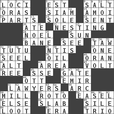 ACROSS 1. Event scenes 5. Eastern Standard Time (abbr.) 8. Table seasoning 12. Mouths or openings 13. Thailand, formerly 15. Mine, in Marseilles 16. Actors' quests 18. Not divided or shared with others 19. Emitted 20. Had dinner 22. Snuggling 24. Christmas carol 26. Player for Phoenix 27. Object of repulsion 28. Perceive with the eye 29. The 23rd letter of the Hebrew alphabet 32. Ballerina skirt 35. Nuclear Threat Initiatives 37. Single 38. Sew up the eyelids of hawks and falcons 39. Lubricate 40. Northwest Algerian city 41. The first octave above the treble staff 42. Type of rug 43. Electrical Unit 44. To riddle 45. Compass dir. 46. Yard entry 49. Baseball player Mel 50. Independent ruler or chieftain 51. Those who practice law 55. Curve 56. Place where flour is made 57. Printing process, for short 59. Artist's stand 63. Otherwise 64. Broad, flat, thick piece 65. Drop; flow; fall 66. Spoils 67. Period 68. Musical group of three DOWN 1. Trim (branches) 2. Mouth or opening 3. Automobile 4. Byzantium, centuries later 5. Double-curved letter 6. The Jewish people; Israel 7. Story 8. Indian antelope 9. So be it 10. Protracted 11. Teat (slang) 14. Makes clutter 17. Portico 21. Car or cant ending 23. Third day of the wk. 25. Poe poem 28. Fodder prepared in a silo 29. "Corrida" creature 30. Of or related to the anus 31. Left 32. Russian ruler of old 33. Ubangi River tributary 34. False hair 36. Make a knot 40. Cloudy 42. Michaelmas daisies 45. Filthy place 47. Housemaid (var.) 48. Hoop that covers a wheel 49. A small or young owl 51. _ and Stitch 52. In addition 53. Hero or heavy, e.g. 54. Play the lead 56. Cartoonist voice _ Blanc 58. Chief or king in Benin or Nigeria 60. Title for a knight 61. Biblical high priest 62. Lion