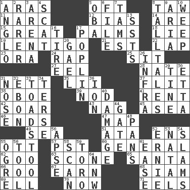 ACROSS 1. Ancient river in northeast Turkey 5. Often (poetically) 8. The 23rd letter of the Hebrew alphabet 11. Drug cop 12. Prejudice 14. "We ___ not amused" (Victoria) 15. Relatively large 17. Insides of hands 18. Falsehood 19. Small, flat, pigmented spot on the skin 21. Eastern Standard Time (abbr.) 22. Pet locale 23. Mouth or opening 24. Reproach for some lapse or misdeed 25. Be seated 27. Snakelike fish 28. Nathan's nickname 31. Remaining after all deductions 35. Cards in a Roman deck? 37. Sudden quick movement 38. Mitch Miller's instrument 39. Lower and raise head in agreement 41. Monthly bill 42. Fly high 43. Tired old horse 45. Toward the sea 46. Conclusions 47. Atlas unit 49. Ocean 51. _ moment's notice (2 wds.) 52. Followers of ems 55. Baseball player Mel 57. Pacific Standard Time (abbr.) 60. Commissioned military rank 62. Thick or sticky substance 63. Biscuitlike quick bread 65. Before Barbara or Clara 66. Friend of Pooh 67. Merit 68. Thailand, formerly 69. Pipe bend 70. Immediately 71. Snakelike fish DOWN 1. White American of non-Hispanic descent 2. More uncommon 3. Sports stadium 4. Scram! 5. Chief or king in Benin or Nigeria 6. Do some clerical work 7. Scottish caps 8. Baron Munchausen's specialties 9. Operatic vocal solo 10. Shed a tear 13. Fast planes 16. Hoop that covers a wheel 17. Cotton for raincoats, e.g. 20. Highlander 26. Kind of red light 29. Prong on a fork 30. Singer James 31. Characteristic smell of wine 32. Inky black, to poets 33. Inedible or poisonous agaric 34. Laconic 36. Electrically charged atom 40. Break 44. Yard entry 48. Baking dishes 50. Domed church section 52. Bert's buddy 53. Brizilian seaport 54. Hits or strikes with great force 55. Legendary monster 56. Implement 58. Examine minutely or intensely 59. "Corrida" creature 61. Comfort 64. Compass dir.
