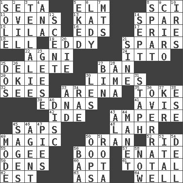 ACROSS 1. Stalk of a moss capsule 5. Shade tree 8. _-fi 11. Baking chambers 13. Krazy ___ of comics 14. Coast Guard woman 15. Pale purple color 16. Begley and Asner 17. 4th largest of the Great Lakes 18. Pipe bend 19. Whirlpool 21. Practice fights 22. Hindu god of fire 24. "Tell ____ the Marines!" 25. Keyboard key 27. Bar 29. Migrant worker of the '30s 30. Citrus fruits 32. Observes 33. Sports stadium 35. Puff or smoke 39. Ferber et al. 41. Opinion 42. Binary compound 43. Electrical Unit 45. Plant excrements 48. Cowardly lion portrayer 49. Mysterious quality of enchantment 50. Northwest Algerian city 52. To free from 55. Double curve, resembling the letter S 56. Surprise greeting 57. Related on the mother's side 59. Hiding places for outlaws 60. Fitting 61. Add up to 62. Eastern Standard Time (abbr.) 63. White ___ sheet 64. Water source DOWN 1. Flatfish 2. Tending to cause great harm 3. Copy Pinocchio 4. Santa ___, CA 5. Supplemented with great effort 6. Kenny Rogers chart-topper in '80 7. Mountains (abbr.) 8. Small fatty European fish 9. Capital of Egypt 10. Angers 12. Aroma 14. Back-to-school mo. 20. Pass on 21. Trig term 23. Honkers 25. Two (Sp.) 26. Supplement with great effort 27. Storage container 28. Nursemaid (var.) 30. French article 31. Staphylococcus 33. Plus 34. Actress Charlotte 36. Make much ado about nothing 37. Apertif with cassis 38. Compass dir. 40. Compact _ 43. Insect wing 44. French painter Edouard 45. Gurus 46. Rep 47. Sliced desserts 49. Method 50. I made a mistake 51. Round or rotation of duties 53. Slanted text style (abbr.) 54. Small valley 56. Sound made by sheep 58. Immediately