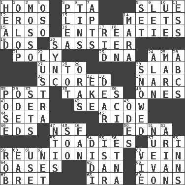 ACROSS 1. Like (prefix) 5. Parent Teacher Assoc. 8. Change direction abruptly 12. Greek god of love 13. Mouth edge 14. Confronts 15. In addition 16. Pleas 19. Two (Sp.) 20. More lively and spirited 21. Many (prefix) 23. Heredity factor (abbr.) 24. Wet nurse (var.) 27. To (old English) 30. Thick slice 31. Tallied 34. Drug cop 35. Mail 38. Proceeds 40. Singles 41. River in Europe 42. Manatee 44. Bristle 45. Travel on or in a vehicle 46. Begley and Asner 47. Science/research agcy. 50. Pulitzer Prize-winning author Ferber 53. Sycophants 57. RI univ. 59. One who advocates reunion 63. Distinctive style or manner 64. Fertile tracts in a desert 65. Daniel's nick name 66. _ the terrible 67. Cy Young winner Saberhagen 68. Lyricist Gershwin 69. Immeasurably long periods of time DOWN 1. Froth on beer 2. Lowest deck of a ship 3. With motion or animation 4. Bear (Spanish) 5. Entreaty 6. Metal containers 7. Flats, for short 8. Arrange properly for use 9. Flowery wreath 10. Shoshoni 11. Double-curved letter 14. Hindu Mythology: god of death 17. To free from 18. Car or cant ending 20. Synchronize (abbr.) 22. A period of five years 24. Actor Alda or Thicke 25. Female horse 26. Lettered men learn these first 28. Small child 29. Mouths or openings 30. Overwhelmed 32. Make supply last 33. Letter starter 35. Airs 36. Wrote a lyric poem 37. Arranges properly for use 39. _-fi 43. Lyric poems 47. Nuclear Threat Initiatives 48. "Barney Miller" actor Jack 49. Avid follower 51. New (sp.) 52. Believer in; advocate of (suffix) 54. "You Light Up My Life" star Conn 55. Austrian river, tributary to the Danube 56. Inactive volcano in Sicily 58. Lodging establishments 59. Director Reiner 60. Hearing organ 61. Purpose 62. Fish or hair follower 63. Compete