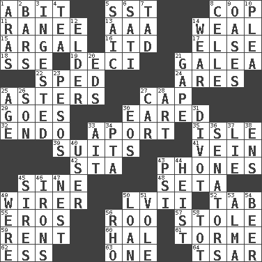 ACROSS 1. "This won't hurt ____!" 5. Fast jet (abbr.) 8. Police officer (slang) 11. The wife of a rajah (variant) 13. Auto club (abbr.) 14. Welt 15. Therefore, facetiously 16. It would 17. Otherwise 18. Compass dir. 19. Tenth: prefix 21. An organ shaped like a helmet 22. Moved rapidly 24. Ancient Greek god of war 25. Michaelmas daisies 27. Head covering 29. Leaves 30. Having ears or earlike features 32. Inside; within (prefix) 33. To the left, to Queeg 35. Small island 39. Costumes for special activities 41. Distinctive style or manner 42. R.R. building 43. Gives a jingle 45. Trig term 48. Stalk of a moss capsule 49. One who wires 50. 57 in ancient Rome 52. Keyboard key 55. Greek god of love 56. Friend of Pooh 57. Took without asking 59. Monthly bill 60. Actor Linden 61. Singer Mel 62. Double-curved letter 63. Single 64. Russian ruler of old DOWN 1. Ancient river in northeast Turkey 2. Oblong pieces of solid material 3. Swallowed 4. Beverage made from leaves 5. Ketch in the Levant 6. Suttee (variant) 7. Small amount or degree 8. Cell (Danish) 9. Fertile tracts in a desert 10. Entreaty 12. A person who is older than you are 14. Erode 20. Begley and Asner 21. Open wide 23. Mexican monetary units 25. Mature 26. Manchild 27. Automobile 28. Nonscientific branch of learning 30. Greek goddess of the dawn 31. A piece of turf (Scot.) 33. Small island 34. Parent Teacher Association (abbr.) 36. Legislators 37. Falsehood 38. Followers of ems 40. One who uses or employs something 43. 23rd letter of the Greek alphabet 44. Robbery 45. Male parents of animals 46. Removes the wrinkles 47. A home for chicks 49. Past tense of be (plural) 50. Grant temporary use of 51. Grand slam 53. _ mater 54. Fermented drink made from hops 56. 17th letter of the Greek alphabet 58. Small child