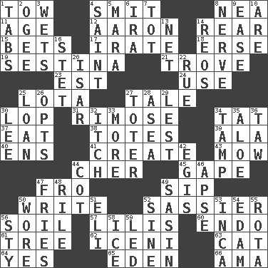 ACROSS 1. Pull behind 4. Stricken, poetically 8. Teachers' org. 11. Ripen 12. Composer Copland 14. Buttocks 15. Stakes 17. Feeling or showing extreme anger 18. Celtic language 19. French poetic form 21. Collection of objects 23. Eastern Standard Time (abbr.) 24. Purpose 25. Globular water bottle used in Asia 27. Falsehood 30. Trim (branches) 31. Full of chinks, cracks, or crevices 34. Make lace 37. Erode 38. Hauls 39. Insect wing 40. Followers of ems 41. Cause to be 43. Cut the grass 44. "Mermaids" star 45. Stare wonderingly 47. Away 49. Small drink 50. Compose 52. More lively and spirited 56. Earth 57. Ms. Damita and namesakes 60. Inside; within (prefix) 61. Woody plant 62. Ancient Celtic tribe of eastern Britain 63. Domesticated feline 64. Affirmative reply 65. Paradise 66. Wet nurse (var.) DOWN 1. Bar bills 2. Double curve, resembling the letter S 3. Moistens 4. Inhabitant of Heaven 5. Hindu Mythology: god of death 6. Retirement account (abbr.) 7. Small child 8. Boldness 9. Comfort 10. "We ___ not amused" (Victoria) 13. Fish or hair follower 14. Vintage cars 16. Proofreading order 20. Austrian river, tributary to the Danube 22. Sorrow 25. Grant temporary use of 26. Elects 27. Carrier 28. At sea 29. For fear that 30. Area sheltered from the wind 32. Hankering 33. Greater amount 34. Pack (down) 35. Medicinal plant 36. The 23rd letter of the Hebrew alphabet 42. Armor plate that protects the chest 44. Small bed 46. Domed church section 47. Strips of potato fried in deep fat 48. Cause heat under the collar 49. Indian antelope 50. Had on 51. Biblical high priest 52. Trig term 53. South American Indian 54. Dutch treat 55. Roll call or roster of names 56. Filthy place 58. Frozen water 59. Directed