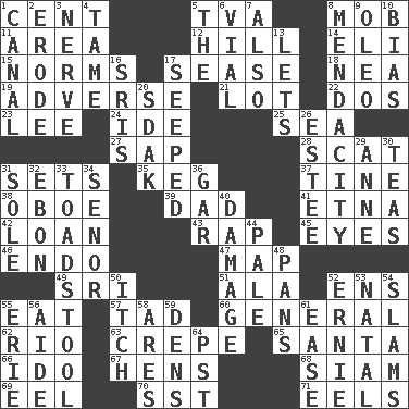 ACROSS 1. Penny 5. Federal power corp. 8. Crowd into 11. Type of rug 12. Land elevation 14. Connecticut Ivy Leaguer 15. Typical standards 17. Gospel singer Marvin 18. Teachers' org. 19. Contrary to your interests or welfare 21. Car dealer's back yard 22. Two (Sp.) 23. Area sheltered from the wind 24. Binary compound 25. Ocean 27. Plant excrement 28. Jazz singing style 31. Arranges properly for use 35. Cask 37. Prong on a fork 38. Mitch Miller's instrument 39. June honoree 41. Inactive volcano in Sicily 42. Grant temporary use of 43. Hit sharply and swiftly 45. Snake ____ (dice throw) 46. Inside; within (prefix) 47. Atlas unit 49. Indian title of respect (Mr.) 51. In the manner of 52. Followers of ems 55. Ingest 57. Small boy 60. Commissioned military rank 62. River (Sp.) 63. Streamer paper 65. Before Barbara or Clara 66. Wedding promise 67. Coop moms 68. Thailand, formerly 69. Snakelike fish 70. Fast jet (abbr.) 71. Snakelike fish DOWN 1. Lessep's creation 2. Eat (away) 3. Impudent aggressiveness 4. Docile 5. Definite Article 6. Small bottle 7. In addition 8. Ananias' fault 9. Margarine 10. Prejudice 13. Allows 16. Indian titles of respect 17. Oozed 20. Neighbor of Neb. 26. First name in cosmetics 29. Singer Murray 30. Beverages made from leaves 31. Not divided or shared with others 32. Inky black, to poets 33. Inedible or poisonous agaric 34. Sir (Sp.) 36. Slender fish 40. Break 44. Light colored 48. Baking dishes 50. Hankering 52. Bert's buddy 53. Relating to or accompanying birth 54. Hits or strikes with great force 55. One of the Great Lakes 56. Helper 58. Ancient Greek god of war 59. Hiding places for outlaws 61. Comfort 64. Pacific Standard Time (abbr.)