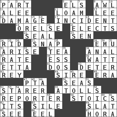 ACROSS 1. Role in a play 5. Raised railways 8. Leather borer 11. Toward shelter 12. Rich soil 13. Area sheltered from the wind 14. Break 17. Happening 19. Threatening words 21. Chooses 22. Lick closed 23. Elected rep. 24. To free from 27. Fastener 29. Australian flightless bird 32. Get up 34. Beverage made from leaves 36. Of or related to the anus 37. Assign a rank or rating to 38. Curvy letter 39. Electrical Unit 40. Singer James 41. Two (Sp.) 42. Prevent from occurring 43. Marina Del _, California 44. Beget 46. Epoch 47. Parent Teacher Association (abbr.) 50. Oceans 52. A viewer who gazes fixedly 55. Ringlike coral islands and reefs 57. News announcer 59. Unemotional ones 62. It is 63. Drop; flow; fall 64. Narrow board 65. Observe 66. Snakelike fish 67. Israeli folk dance DOWN 1. Writing tablet 2. Chicken ___ king 3. San ____ (Riviera town) 4. Pulls apart 5. Period of immesurable duration 6. Shoestrings 7. Grin 8. Actor Baldwin 9. Gone 10. Allows 12. Whopper 15. Honkers 16. Style 18. Lair 20. Scheduled 24. More uncommon 25. Feeling or showing extreme anger 26. Simple song 28. Mexican monetary units 29. Maternal 30. Mother 31. Extreme 33. Ocean 35. Help 36. Deep reverence 42. Started a card game 45. Vintage cars 47. Adept person 48. Laconic 49. Nick name for Arthur 51. Splash clumsily 52. Indian titles of respect 53. False hair 54. Domed church section 55. "We ___ not amused" (Victoria) 56. Grain storage tower 58. Pipe bend 60. Automobile 61. R.R. building
