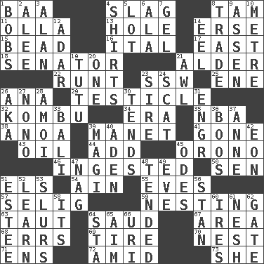 ACROSS 1. Sound made by sheep 4. Volcanic refuse 8. Scottish cap 11. Rounded earthenware pot or jar 13. Hollow 14. Celtic language 15. Necklace unit 16. Slanted text style (abbr.) 17. Compass direction 18. Elected representative 21. Tree or shrub in the Birch family 22. Undersized animal 23. Compass dir. 25. Compass dir. 26. Santa ___, CA 29. One of the two male reproductive glands 32. Dried seaweed eaten as food 34. Period 35. Basketball assoc. 38. Small Philippine buffalo 39. French painter Edouard 41. Went 43. Lubricate 44. Increase 45. U. of Maine site 46. Swallowed 50. Elected rep. 51. Raised railways 54. The 18th letter of the Arabic alphabet 55. Nights before holidays 57. Major League Baseball Commissioner Bud 59. Snuggling 63. Drawn tight 64. Saudi Arabian king (1953-1964) 67. Length times width 68. Blunders 69. Hoop that covers a wheel 70. Egg locale 71. Followers of ems 72. Among 73. A female animal or person DOWN 1. Moves up and down 2. Toward shelter 3. Actor Alda or Thicke 4. Upper-body garments 5. Car dealer's back yard 6. According to 7. Set 8. Buy and sell 9. NE Netherlands city 10. Distance measurement (Brit.) 12. The sixth month of the Jewish calendar 14. Snakelike fish 19. Ballerina skirt 20. Single 21. Leather borer 23. Title for a man of rank and authority 24. Scram! 26. Alias (abbr.) 27. Words to Nanette 28. Mine, in Marseilles 30. Watches over 31. Engineer (abbr.) 33. Indonesian resort city 36. Scornful sounds 37. Singer Murray 39. Wise men 40. An important port of Yemen 42. Period of immesurable duration 45. Lyric poems 47. Tired old horse 48. Looked after 49. Night before a holiday 51. First name in cosmetics 52. Memorize 53. Runs notes together 56. Comedian Laurel of Laurel & Hardy 58. ___ a Wonderful Life 60. Angers 61. Soft 62. Yard entry 64. R.R. building 65. Direct toward a target or goal 66. RI univ.