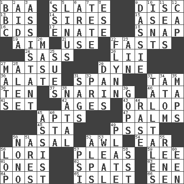 ACROSS 1. Sound made by sheep 4. Schedule 9. Plate 13. Again 14. Male parents of animals 15. Toward the sea 16. Music discs 17. Related on the mother's side 18. Fastener 19. Direct toward a target or goal 21. Purpose 22. Goes without food and/or water 24. Backtalk 26. Cards in a Roman deck? 27. Taiwanese island in East China Sea 29. Centimeter-gram-second unit of force 30. Having winglike extensions 31. Connect, as a bridge 33. Scottish cap 36. Nine, plus one 37. Catching in a trap 40. "One Day ___ Time" 41. Arrange properly for use 42. Ripens 43. Fourth or lowest deck 45. Flats, for short 47. Insides of hands 48. R.R. building 49. Inconspicuous attention getter 50. Relating to the nose 52. Leather borer 54. Ewer handle 56. Australian parrot (variant) 57. Entreaties 59. Area sheltered from the wind 61. Singles 62. Arguments over trivial matters 63. Compass dir. 64. Mail 65. Small island 66. Elected rep. DOWN 1. English channel? 2. Opera by Verdi 3. Aide 4. Compass dir. 5. "_ and Lucy" (Charlie Brown theme song) 6. Ancient river in northeast Turkey 7. Wig 8. Compass dir. 9. Small ungulate mammals of Africa 10. Is not 11. Oceans 12. Head covering 20. Vertical spar for supporting sails 22. Film actor Errol 23. The 18th letter of the Arabic alphabet 25. Takes to court 27. Floor protectors 28. Toward shelter 29. Raised platform 31. Droops 32. Before (prefix) 33. Baron Munchausen's specialties 34. Smallest unit of an element 35. Atlas contents 38. Brizilian seaport 39. Republicans 44. To erase 45. Help 46. Parent Teacher Association (abbr.) 49. Food holder 50. Words to Nanette 51. Ancient Greek god of war 52. High mountains 53. Welt 55. French philosopher Descartes 56. Trim (branches) 57. Air pressure measure (abbr.) 58. Fast jet (abbr.) 60. Car or cant ending