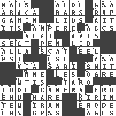 ACROSS 1. Floor protectors 5. _ vera 9. Girls' org. (abbr.) 12. Phillipine bananalike plant 14. Drinking establishments 15. Strike 16. Homeless child 17. Flaplike coverings 18. Small island 19. ___ a Wonderful Life 20. Electrical Unit 23. Lettered men learn these first 24. Jai ____ 25. Advice 27. Religious group 30. Fenced enclosure 32. Hat (slang) 33. Silent film actress Nazimova 34. Leave at once 36. Snakelike fish 38. Air pressure measure (abbr.) 39. Compass dir. 40. White ___ sheet 43. By way of 46. Indian skirt 48. In a ____ (agitated or irritated) 49. Compass dir. 51. French article 52. Legendary monster 53. Nuclear Threat Initiatives 54. Pacific island yam 56. Implement 58. Device for capturing images 61. Back 64. Australian flightless bird 65. Female horse 66. Japanese brewing company 68. "___ Little Indians" 69. SW Asia republic 70. Eat (away) 71. Followers of ems 72. Global Positioning Systems (abbr.) 73. Matures DOWN 1. Wise men 2. Blind as ____ 3. Scottish caps 4. _-fi 5. Competent 6. Den 7. Severe or trying experience 8. Double-curved letter 9. Seizes 10. Ketch in the Levant 11. Tenement units (abbr.) 13. Of or related to the anus 21. Atlas contents 22. Parts 23. Assistant 24. _ moment's notice (2 wds.) 26. Compete 27. Plant excrement 28. Raised railways 29. 154 in Roman numerals 31. Rhinal 35. Cigar-shaped 37. Austrian-born American filmmaker Fritz 41. Title for a knight 42. Had dinner 44. International (abbr.) 45. Black tropical American cuckoo 47. Austrian river, tributary to the Danube 48. "Barney Miller" actor Jack 50. Fortification 53. Parts of speech 55. Libertine 56. False hair 57. Sign of things to come 59. Caspian sea tributary 60. Not women's 61. Tree-dwelling hopper 62. Travel on or in a vehicle 63. Washington bills 65. Russian fighter aircraft 67. Retirement account (abbr.)
