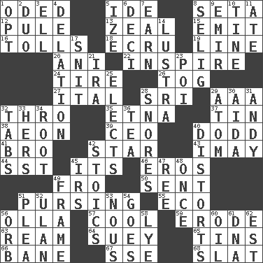 ACROSS 1. Wrote a lyric poem 5. Binary compound 8. Stalk of a moss capsule 12. Whimper 13. Ardor 15. Send forth 16. For Whom the Bell _____ 18. Shade of tan 19. Actor's bit 20. Black tropical American cuckoo 22. Stimulate to action 24. Hoop that covers a wheel 26. Coat; cloak 27. Slanted text style (abbr.) 28. Indian title of respect (Mr.) 29. American Automobile Association (abbr.) 32. Through, poetically 35. Inactive volcano in Sicily 37. Shallow baking pan 38. Age 39. Corporate head (abbr.) 40. Texas town _ City 41. Sis' sibling 42. Play the lead 43. "If ____ say so..." 44. Fast jet (abbr.) 45. It is 46. Greek god of love 49. Back 50. Transmitted 51. Puckering 55. Environmental prefix 56. Water jar 57. Calm and collected 59. Eat (away) 63. 480, 500 or 516 sheets of paper 64. Chop _ 65. Canisters 66. Object of repulsion 67. Compass dir. 68. Narrow board DOWN 1. Elect 2. Superhero pair 3. Pipe bend 4. Conveyance 5. Ending with capital 6. Tenth: prefix 7. Merit 8. Former Milwaukee Brewers owner Bud 9. Arab leader 10. Prong on a fork 11. Had dinner 14. A period of five years 17. In a ____ (agitated or irritated) 21. Lyricist Gershwin 23. Luau course 25. Opts 28. Sounds asleep 29. Tiny particle 30. Opera by Verdi 31. "60 Minutes" Commentator Rooney 32. Bar bills 33. Possessive pronoun 34. Carrot, for example 36. Beverage made from leaves 40. What propaganda does 42. Unemotional ones 45. Big collection agency 47. Portuguese money of account (variant) 48. Single time 49. Movie unit 51. Entreaty 52. Uhlan (variant) 53. Horse sense 54. Moves 56. Globe 58. Sodium hydroxide 60. Lubricate 61. Heredity factor (abbr.) 62. Eastern Standard Time (abbr.)