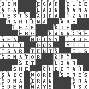 ACROSS 1. Storage container 4. Mild oath 8. Writer Wiesel 12. "One Day ___ Time" 13. (Had) reclined 14. Grandmother 15. Musical pauses 18. Opera by Verdi 19. Czar 20. Chrissie's court nemesis 22. "We ___ not amused" (Victoria) 23. Path through which fluid escapes 24. Expire 25. Away 26. Flamboyance 30. Ocean 33. Annoyingly loud 36. Loyal 37. Table seasoning 39. Two (Sp.) 40. Shout 41. Russian ruler of old 42. Portable shelters 44. Raised railways 45. Elected representative 47. Choose 50. Be seated 51. One who doesn't tell the truth 53. A female animal or person 54. Leopard's kin 57. Ketch in the Levant 59. Had on 61. Founders of families 63. Pulitzer Prize-winning author Ferber 64. SW Asia republic 65. Period 66. Genesis locale 67. Negative votes 68. Acura sports coupe DOWN 1. Soap unit 2. Detail 3. Relating to the nose 4. Style 5. Greek goddess of the earth (variant) 6. Help 7. Heredity factor (abbr.) 8. Plea 9. Goldbrick 10. _ tizzy (2 wds.) 11. Hearing organ 16. Not kosher 17. Play the lead 21. Visual representation of an object 22. The 18th letter of the Arabic alphabet 24. 24 hours 26. Inconspicuous attention getter 27. Algonquian 28. Frame or body of a ship 29. Snakelike fish 30. Fast planes 31. Relaxation 32. Actor Alda or Thicke 34. Baltic tributary 35. Electrically charged atom 38. File 13 42. Small child 43. Flatfish 46. Standoff 48. Sliced desserts 49. Jacques of French films 52. More valued for its uncommonness 53. Trig term 54. Supercomputer manufacturer 55. Coop moms 56. Possessive pronoun 57. Perceive with the eye 58. Increase 59. Acquire through effort 60. Mouth or opening 62. Saxophone