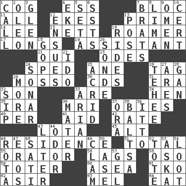 ACROSS 1. Gear tooth 4. Curvy letter 7. Coalition 11. 100% 12. Supplements with great effort 13. First class 14. Area sheltered from the wind 15. Remaining after all deductions 16. Nomad 17. Yearns 19. Aide 21. Fr. "Yes" 23. Lyric poems 24. Moved rapidly 25. A saturated hydrocarbon 26. Label 29. With motion or animation 30. Music discs 31. Epoch 32. Male child 33. "We ___ not amused" (Victoria) 34. Layer 35. Lyricist Gershwin 36. Medical imaging device (abbr.) 37. Off-Broadway awards 40. For each 41. Help 42. Assign a rank or rating to 43. Globular water bottle used in Asia 45. The first octave above the treble staff 46. Home 51. Add up to 55. Speaker 56. Falls behind 58. Bear (Spanish) 59. Carrier 60. At sea 61. Ring climax 62. SW Saudi Arabia district 63. Cartoonist voice _ Blanc 64. Consume DOWN 1. Give a ring to 2. Butter sub 3. Small, secluded valley 4. Make supply last 5. Stalk of a moss capsule 6. Fast planes 7. Naughty children 8. Pale green bean 9. Sign of things to come 10. Sure thing 12. Follows as a consequence or result 13. Introduce or present, as a question 16. Amusement-park features 18. Republicans 20. Something which is sent 22. Wedding promise 24. Echolocation 25. Sour-tasting 26. Giggle 27. Ancient Greek god of war 28. Separate the seeds from cotton 29. Greater amount 32. Small drink 33. Believer in; advocate of (suffix) 36. Mother 37. Mouth or opening 38. Greek mezzo-soprano Agnes 39. "Tell ____ the Marines!" 43. 61 cubic inches 44. Scent 46. Roll call or roster of names 47. Greek god of love 48. Suttee (variant) 49. Burrowing marine mollusk 50. Comfort 52. Haul 53. "____ silly question..." 54. Spoils 57. Set