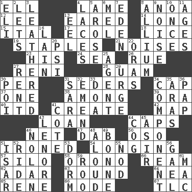 ACROSS 1. Pipe bend 4. Unable to walk 8. Small Philippine buffalo 12. Area sheltered from the wind 13. Having ears or earlike features 14. Yearn 15. Slanted text style (abbr.) 17. Learning spot: Fr. 18. Louse (plural) 19. Paper fasteners 21. Annoying sounds 23. Part of HMS, perhaps 24. Ocean 26. Sorrow 27. Painter Guido (1575-1642) 28. Island territory of the United States 30. For each 31. Spring feasts 34. Head covering 37. Single 38. Amid 39. Mouth or opening 40. It would 41. Cause to be 42. Atlas unit 43. Grant temporary use of 44. Smile enhancers 46. Fish or hair follower 47. Apply (a substance) by light strokes 50. Bear (Spanish) 51. Pressed 54. Yearning 57. Grain storage tower 58. U. of Maine site 60. 480, 500 or 516 sheets of paper 62. The sixth month of the Jewish calendar 63. Single shot of ammunition 64. Teachers' org. 65. French philosopher Descartes 66. Method 67. Affectionate concern, for short DOWN 1. Connecticut Ivy Leaguer 2. Allows 3. Resembling or made to resemble leather 4. Shoestrings 5. Came up 6. Cartoonist voice _ Blanc 7. Paradise 8. Plant genus of onion and garlic 9. Annoying sound 10. At one time in the past 11. Grows older 13. Snakelike fish 16. (Had) reclined 20. 23rd letter of the Greek alphabet 22. Mouths or openings 25. Rep 27. Monthly bill 29. Goad 30. Luau course 31. "Two Mules for Sister ____" 32. Make improvements or corrections to 33. ___ good deed 34. Part 35. Caspian sea tributary 36. Infant food 41. ____ d'Azur (French Riviera) 43. Poe poem 44. Gear tooth 45. SW Saudi Arabia district 46. Pitcher Ryan 48. Verbally 49. Maid-servant 51. Austrian river, tributary to the Danube 52. Travel on an animal 53. Dormintory (informal) 55. Lower and raise head in agreement 56. Highlander 59. Friend of Pooh 61. Big _