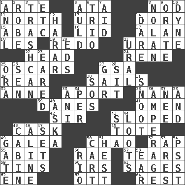 ACROSS 1. Johnson of "Laugh-In" 5. "One Day ___ Time" 8. Dreamland 11. 0 degrees 13. RI univ. 14. Dinghy 15. Phillipine bananalike plant 16. Hat (slang) 17. Actor Alda or Thicke 18. French article 19. Make new 21. A salt of uric acid 22. Froth on beer 24. French philosopher Descartes 25. Motion picture awards 27. Girls' org. (abbr.) 29. Bring up, as a child 30. Travel by water 32. Singer Murray 33. To the left, to Queeg 35. Grandmother 39. Natives or inhabitants of Denmark 41. Sign of things to come 42. Title for a knight 43. Slanted 45. Keg 48. Carryall 49. An organ shaped like a helmet 50. US Secretary of Labor Elaine L. _ 52. Hit sharply and swiftly 55. "This won't hurt ____!" 56. Actress Charlotte 57. Pulls apart 59. Metal containers 60. Big collection agency 61. Gurus 62. Compass dir. 63. Baseball player Mel 64. Relief DOWN 1. Of or related to the anus 2. Loose flowing garment 3. File 13 4. And so on (abbr.) 5. Old (Scot.) 6. Musical group of three 7. Help 8. Pitcher Ryan 9. Declaim 10. Unit of force 12. Ethiopian city, capital of Harari 14. Have the gumption 20. Begley and Asner 21. Mountain range 23. Having ears or earlike features 25. Mouth or opening 26. Elected rep. 27. Slender fish 28. Be seated 30. Distress signal 31. Snob 33. Black tropical American cuckoo 34. For each 36. Electrical Measurement 37. Born 38. Plus 40. "____ silly question..." 43. R.R. building 44. Plunders 45. Apartment or room in a ship 46. Place in a line 47. Arranges properly for use 49. Yard entry 50. Heavy open wagon 51. Command 53. Ancient Greek god of war 54. Inconspicuous attention getter 56. River (Sp.) 58. Hearing organ