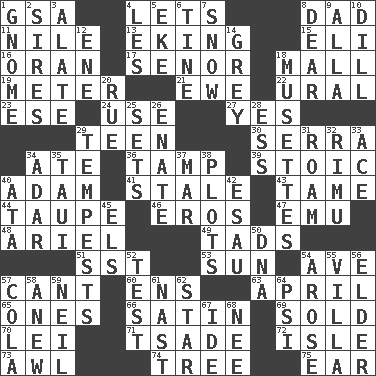 ACROSS 1. Girls' org. (abbr.) 4. Allows 8. Male parent 11. The longest river in the world 13. Supplementing with great effort 15. Biblical high priest 16. Northwest Algerian city 17. Sir (Sp.) 18. Shopping center 19. Distance measurement 21. She-sheep 22. Mountain range 23. Compass dir. 24. Purpose 27. Affirmative reply 29. Adolescent 30. Spanish missionary in California 34. Had dinner 36. Pack (down) 39. Unemotional 40. First man 41. Lacking originality or spontaneity 43. Not wild 44. Grayish beige 46. Greek god of love 47. Australian flightless bird 48. Satellite of Uranus 49. Bits 51. Fast jet (abbr.) 53. Player for Phoenix 54. "___ Maria" 57. Patter 60. Followers of ems 63. Showery time 65. Singles 66. Smooth fabric 69. Exchanged or delivered for money 70. Flowery wreath 71. Sadhe (variant) 72. Small island 73. Leather borer 74. Family _ (genealogy) 75. Ewer handle DOWN 1. Dwarf 2. Founders of families 3. Having winglike extensions 4. French article 5. Make supply last 6. Prong on a fork 7. Frozen precipitation 8. Letter starter 9. Silent film actress Nazimova 10. Deli pickle 12. Compass dir. 14. Jennifer or Joel 18. French bagpipes 20. Sorrow 25. Arranges properly for use 26. Maternal 28. Curvy letter 29. Storms 31. Wander 32. Tall New Zealand timber tree 33. Adept person 34. The sixth month of the Jewish calendar 35. "Change" in Tahitian 37. Make imperfect 38. Ground plans 40. _ moment's notice (2 wds.) 42. Son of Isaac 45. Raised railways 50. Heredity factor (abbr.) 52. Trial 54. Came up 55. Country residence 56. A person who is older than you are 57. Root beer relative 58. Afresh 59. Famous astronaut Armstrong 61. Political cartoonist Thomas 62. Play the lead 64. 23rd letter of the Greek alphabet 67. Binary compound 68. Born