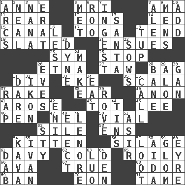 ACROSS 1. Singer Murray 5. Medical imaging device (abbr.) 8. Wet nurse (var.) 11. Stern 12. Immeasurably long periods of time 14. Directed 15. Lessep's creation 17. Ancient Roman robe 18. Be inclined (to) 19. Scheduled 21. Follows as a consequence or result 23. Symbol (abbr.) 25. Cease 26. Inactive volcano in Sicily 27. The 23rd letter of the Hebrew alphabet 28. Container for groceries 31. HTML Container Element 33. Make supply last 35. Any of the three canals of the cochlea 37. Libertine 38. Ewer handle 40. At once, immediately (arch.) 41. Came up 43. Small child 45. Area sheltered from the wind 46. Writing instrument 47. Cartoonist voice _ Blanc 50. Small bottle 52. Drop; flow; fall 53. Followers of ems 54. Baby cat 56. Fodder prepared in a silo 61. American folk hero Crockett 62. Lacking warmth 65. Turbulent 66. Actress Gardner 67. Loyal 68. Aroma 69. Prohibit 70. Age 71. Docile DOWN 1. Arches 2. Anneal 3. Grandmother 4. Part of Q.E.F. 5. Was introduced to 6. Friend of Pooh 7. Eat 8. Toward shelter 9. Not women's 10. Find the sum of 13. Before Barbara or Clara 16. For fear that 18. Uncastrated adult male sheep 20. Unit of force 22. Sty mamas 24. Cause to be 26. Nights before holidays 28. Object of repulsion 29. _ vera 30. Separate the seeds from cotton 31. Have the gumption 32. Visual representation of an object 34. Consume 36. Give a ring to 37. Reproach for some lapse or misdeed 39. Be footloose 42. Give off 44. Airtight sealed metal containers 48. Opt 49. Poe poem 51. SW Saudi Arabia district 52. Filthy place 54. Polynesian shrub of the pepper family 55. _ the terrible 57. Plunder 58. Opera by Verdi 59. Take by theft 60. Jane of fiction 61. Pat or tap gently 63. Nilotic language 64. Lair