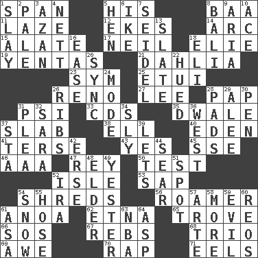 ACROSS 1. Connect, as a bridge 5. Part of HMS, perhaps 8. Sound made by sheep 11. Goldbrick 12. Makes supply last 14. Curve 15. Having winglike extensions 17. Famous astronaut Armstrong 18. Writer Wiesel 19. Gossips 21. Mexican or Central American flower 23. Symbol (abbr.) 25. Needle case 26. Western Nevada city 27. Area sheltered from the wind 28. Infant food 31. Air pressure measure (abbr.) 33. Music discs 35. A sleeping potion; an opiate (poet.) 37. Thick slice 38. Pipe bend 40. Locale of original sin 41. Laconic 43. Affirmative reply 45. Compass dir. 46. American Automobile Association (abbr.) 47. Marina Del _, California 50. Trial 52. Capri or Wight 53. Plant excrement 54. Fragments 56. Nomad 61. Small Philippine buffalo 62. Inactive volcano in Sicily 65. Collection of objects 66. Mayday 67. Confederate soldiers (slang) 68. Musical group of three 69. Deep reverence 70. Reproach for some lapse or misdeed 71. Snakelike fish DOWN 1. Kill 2. Diluted with white 3. Muslim summons to prayer 4. Remaining after all deductions 5. Layer 6. D.D.E's nickname 7. Beer mug 8. Indonesian resort city 9. Operatic vocal solo 10. Adept person 13. Chalkboard 16. Relaxation 18. Biblical high priest 20. Synchronize (abbr.) 22. Took on color 24. Method 26. Chest bones 28. Writing tablets 29. Toward shelter 30. Writing instrument 31. Entreaty 32. "Two Mules for Sister ____" 34. Mischievous 36. 270 degrees 37. R.R. building 39. Allows 42. Celtic language 44. Shrivel 48. A person who is older than you are 49. Of or pertaining to yesterday 51. Specific locale 52. Retirement account (abbr.) 54. Frozen precipitation 55. Stockings 57. Johnson of "Laugh-In" 58. Greater amount 59. Tending to cause great harm 60. Vintage cars 61. White ___ sheet 63. Basketball assoc. 64. Viper