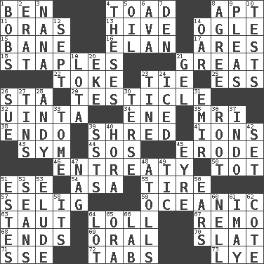 ACROSS 1. Benjamin's nick name 4. Frog relative 8. Fitting 11. Mouths or openings 13. Hub of activity 14. Stare 15. Object of repulsion 16. Enthusiasm 17. Ancient Greek god of war 18. Paper fasteners 21. Relatively large 22. Casino tip 23. Neckwear 25. Double-curved letter 26. R.R. building 29. A testis 32. National forest in Provo, Utah 34. Compass dir. 35. Medical imaging device (abbr.) 38. Inside; within (prefix) 39. Tear up 41. Charged particles 43. Symbol (abbr.) 44. Mayday 45. Wear away 46. Plea 50. Small child 51. Compass dir. 54. White ___ sheet 55. Become fatigued 57. Major League Baseball Commissioner Bud 59. Pertaining to the sea 63. Drawn tight 64. Hang loosely or laxly 67. San ____ (Riviera town) 68. Extremities 69. Taken by mouth 70. Narrow board 71. Compass dir. 72. Bar bills 73. Sodium hydroxide DOWN 1. Moves up and down 2. Part of Q.E.F. 3. Nanny 4. College papers 5. Lubricate 6. Actress Gardner 7. Lair 8. Match 9. Entreaties 10. Trials 12. Back-to-school mo. 14. Rowing implement 19. Globular water bottle used in Asia 20. Make supply last 21. Set 23. Prong on a fork 24. On the rocks 26. Take to court 27. Canisters 28. Actor Griffith 30. Laconic 31. Independent ruler or chieftain 33. Heavy book 36. Carrot, for example 37. Southeast Asian peninsula 39. Fast planes 40. Israeli folk dance 42. Arrange properly for use 45. Jane of fiction 47. Tired old horse 48. Ringlike coral islands and reefs 49. Nervous spasm 51. _____ Park, CO 52. Seines 53. Dodge 56. Hearing organs 58. ___ a Wonderful Life 60. 1994 drama film starring Jodie Foster 61. "If ____ say so..." 62. ____ d'Azur (French Riviera) 64. Car dealer's back yard 65. Mouth or opening 66. Experiment locale