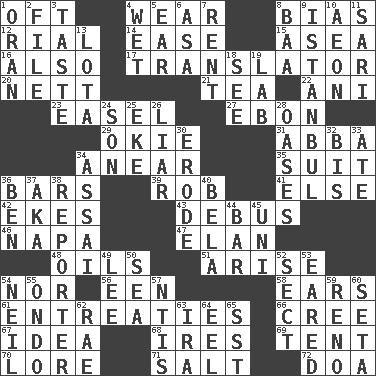 ACROSS 1. Often (poetically) 4. Erode 8. Prejudice 12. Monetary unit of Yemen 14. Comfort 15. Toward the sea 16. In addition 17. Interpreter 20. Remaining after all deductions 21. Beverage made from leaves 22. Black tropical American cuckoo 23. Artist's stand 27. Inky black, to poets 29. Migrant worker of the '30s 31. Swedish rock group 34. Approach 35. Set of matching outer garments 36. Oblong pieces of solid material 39. Director Reiner 41. Otherwise 42. Makes supply last 43. Alight from a bus 46. California wine valley 47. Flair 48. Petroleums 51. Get up 54. Not either 56. Car or cant ending 58. Hearing organs 61. Pleas 66. Algonquian 67. It may be bright or harebrained 68. Angers 69. Portable shelter 70. Old wives' tales, e.g. 71. Table seasoning 72. ___ good deed DOWN 1. NW Algerian seaport 2. Do some clerical work 3. Clothes sense 4. Dripping 5. Hearing organ 6. White ___ sheet 7. Monthly bill 8. Sound made by sheep 9. Byzantium, centuries later 10. Period of immesurable duration 11. Indian skirt 13. Globular water bottle used in Asia 18. Perceive with the eye 19. Experiment locale 24. Male offspring 25. Make supply last 26. One who doesn't tell the truth 28. Fertile tracts in a desert 30. Eat (away) 32. Altar cloth linen 33. Had dinner 34. Slender Brazilian palm 36. Benjamin's nick name 37. Alias (abbr.) 38. News announcer 40. Actor Lugosi 44. Tavern 45. University (slang) 49. Area sheltered from the wind 50. Ocean 52. Religious group 53. Having ears or earlike features 54. Famous astronaut Armstrong 55. Southwest Nigerian state 57. Nuclear Threat Initiatives 59. Western Nevada city 60. Stalk of a moss capsule 62. Actress Charlotte 63. Retirement account (abbr.) 64. Snakelike fish 65. Fast jet (abbr.)