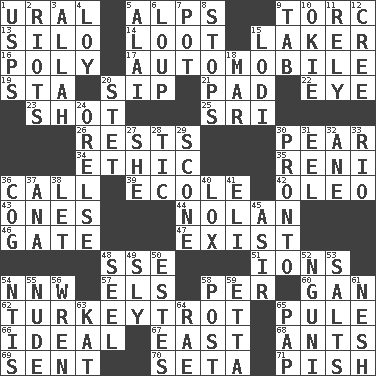 ACROSS 1. Mountain range 5. High mountains 9. Torque (variant) 13. Grain storage tower 14. Spoils 15. Member of a famous L.A. basketball team 16. Many (prefix) 17. Form of transportation 19. R.R. building 20. Small drink 21. Groovy apt. 22. Sight organ 23. Guess 25. Indian title of respect (Mr.) 26. Musical pauses 30. Lightbulb-shaped fruit 34. Value system 35. Painter Guido (1575-1642) 36. Give a ring to 39. Learning spot: Fr. 42. Margarine 43. Washington bills 44. Pitcher Ryan 46. Yard entry 47. Be 48. Compass dir. 51. Charged atoms 54. Compass dir. 57. Raised railways 58. For each 60. Separate the seeds from cotton 62. Ragtime dance 65. Whimper 66. Perfect 67. 90 degrees 68. Pismires 69. Transmitted 70. Stalk of a moss capsule 71. Expression of disdain DOWN 1. United States Postal Service (abbr.) 2. Disturbances 3. Assad's deity 4. Myrna of the movies 5. Mountain range southwest of Kyrgyzstan 6. Central Nebraska county 7. Cooking vessel 8. Discontinues 9. Keyboard key 10. Migrant worker of the '30s 11. Have confidence or faith in 12. Algonquian 15. Farming town in central California 18. Make imperfect 20. Proofreading order 24. Threatening words 27. A female animal or person 28. Nervous spasm 29. Biscuitlike quick bread 30. Right away 31. Snakelike fish 32. One (Scot) 33. River (Sp.) 36. Gear tooth 37. Santa ___, CA 38. Allow 40. Brine-cured salmon 41. Biblical high priest 45. SW Saudi Arabia district 48. Stitch closed the eyes of (a falcon) 49. Playfully artful 50. _____ Park, CO 52. Group of southern Bantu languages 53. Table seasonings 54. Nuclear Threat Initiatives 55. Unadorned 56. Songbird 58. Mail 59. Singer James 61. Tender 63. Krazy ___ of comics 64. Actress Charlotte 65. Infant food