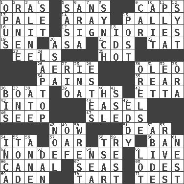 ACROSS 1. Mouths or openings 5. Without 9. Smile enhancers 13. Diluted with white 14. Like ___ of sunshine 15. Friendly 16. A single undivided whole 17. Seigniories (variant) 19. Elected rep. 20. White ___ sheet 21. Music discs 22. Make lace 23. Snakelike fish 25. Being at a high temperature 26. Nest on high 30. Margarine 34. Aches 35. Hitchcock's "____ Window" 36. Water vessel 39. Expletives 42. Singer James 43. To the inside or interior of 44. Artist's stand 46. Ooze 47. Bobsleighs 48. At this time 51. Letter starter 54. Call ___ day 57. Rowing implement 58. Attempt to accomplish something 60. Forbid 62. Unrelated to defense, as in spending 65. Moving, as bait 66. Lessep's creation 67. Oceans 68. Lyric poems 69. An important port of Yemen 70. Small pie 71. Trial DOWN 1. Musical composition 2. The wife of a rajah (variant) 3. Place in a line 4. Arrange properly for use 5. Backtalk 6. Operatic vocal solo 7. Tired old horse 8. Synchronize (abbr.) 9. Auto 10. Came down and settled, as after flight 11. Entreaty 12. System (abbr.) 15. Mail 18. Wedding promise 20. At sea 24. Portable computer 27. River (Sp.) 28. _ tizzy (2 wds.) 29. _____ Park, CO 30. Threatening words 31. Allow 32. Consume 33. Mouth or opening 36. Again 37. Single 38. Had dinner 40. Actor Linden 41. Compass dir. 45. Whirlpool 48. Christmas carol 49. Clumsy lout 50. Obtain by seizing forcibly or violently 52. Remain 53. All-night dance parties 54. South American Indian 55. Frog relative 56. Singer Murray 58. Russian ruler of old 59. Relief 61. A home for chicks 63. One of the 12 tribes of Israel 64. Teachers' org. 65. Car dealer's back yard