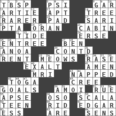 ACROSS 1. Cook's measure (abbr.) 5. 23rd letter of the Greek alphabet 8. Slender fish 11. Nick name for Arthur 13. Fitting 14. Family _ (genealogy) 15. More uncommon 16. Groovy apt. 17. Indian skirt 18. Parent Teacher Association (abbr.) 19. NW Algerian seaport 21. Small house or cottage 22. Periodic rise and fall of the sea level 24. Celtic language 25. Main course 27. Benjamin's nick name 29. Small Philippine buffalo 30. Continued (abbr.) 32. Monthly bill 33. Catcalls? 35. To erase 39. Honor 41. So be it 42. Medical imaging device (abbr.) 43. Slept 45. Ancient Roman robe 48. Algonquian 49. Finish lines 50. Mine, in Marseilles 52. Sorrow 55. Domed church section 56. Bear (Spanish) 57. Any of the three canals of the cochlea 59. Adolescent 60. To free from 61. _ Allan Poe 62. Double-curved letter 63. "We ___ not amused" (Victoria) 64. Elected reps. DOWN 1. Canvas cover 2. Naughty child 3. Ski resort town in Vermont 4. Sliced dessert 5. Dad 6. Connect, as a bridge 7. It would 8. Takes hold of 9. Nest on high 10. It's straight from the horse's mouth 12. Wear away 14. Russian ruler of old 20. To riddle 21. Penny 23. Feeling or showing extreme anger 25. Hearing organ 26. Compass dir. 27. Arrow shooter 28. Followers of ems 30. Small bed 31. Window treatment 33. Spoil 34. Biblical high priest 36. Electrical Measurement 37. Perceive with the eye 38. Conclude 40. Dec. holiday 43. Non-commissioned officer (abbr.) 44. Originate 45. Drinks excessively 46. Fertile tracts in a desert 47. Small, secluded valley 49. Yard entry 50. SW Saudi Arabia district 51. Method 53. Uhlan (variant) 54. Hearing organs 56. Mouth or opening 58. Music discs