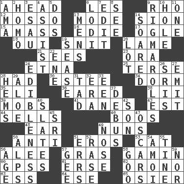 ACROSS 1. Forward in time 6. French article 9. 17th letter of the Greek alphabet 12. With motion or animation 13. Method 14. The Jewish people; Israel 15. Collect or gather 16. Singer Brickell 17. Stare at amorously 18. Fr. "Yes" 19. In a ____ (agitated or irritated) 20. Unable to walk 21. Observes 23. Mouth or opening 24. Inactive volcano in Sicily 25. Laconic 28. Possessed 30. First name in cosmetics 34. Dormintory (informal) 35. Connecticut Ivy Leaguer 36. Having ears or earlike features 38. Cards in a Roman deck? 39. Crowds into 41. Natives or inhabitants of Denmark 43. Eastern Standard Time (abbr.) 44. Makes a sale 46. Expressions of contempt or scorn 48. Ewer handle 49. Religious women 50. Opposed to 51. Greek god of love 53. Domesticated feline 56. Toward shelter 57. Pate de foie ____ 58. Homeless child 60. Global Positioning Systems (abbr.) 61. Celtic language 62. U. of Maine site 63. Double-curved letter 64. Compass dir. 65. Flexible twig of a willow tree DOWN 1. Nanny (var.) 2. Like (prefix) 3. Son of Isaac 4. Help 5. Two (Sp.) 6. Farming town in central California 7. Prepare for publication 8. Perceive with the eye 9. Frustrating wastes of time 10. Hollow 11. Single 13. Not women's 14. Flew 19. Gospel singer Marvin 20. Car dealer's back yard 22. Compass dir. 24. The property of being fit to eat 26. Indian titles of respect 27. Send forth 28. Equivocates 29. Medicinal plant 31. Small amount or degree 32. Epoch 33. Car or cant ending 37. Alight from a bus 40. Chalkboards 42. Manchild 45. Indian title of respect (Mr.) 47. Motion picture awards 49. Olfactory organ 50. High mountains 51. Blunders 52. To erase 54. Mine, in Marseilles 55. Prong on a fork 56. Ripen 57. Unit of force equal to gravity 58. Thick or sticky substance 59. And not