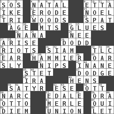 ACROSS 1. Mayday 4. Brizilian seaport 9. Singer James 13. Mamie's husband 14. Wear away 15. Christmas carol 16. Three (prefix) 17. Forest 18. Petty quarrel 19. Grow older 21. Mountains (abbr.) 22. Cements 24. Grandmother 26. Born 27. Get up 29. Texas town _ City 30. Disturbances 31. Thailand, formerly 33. Affectionate concern, for short 36. Hearing organ 37. More overdramatic by comparison 40. Rowing implement 41. Mischievous 42. Pinches, bites 43. Silly 45. Proofreading order 47. Evade 48. Lyricist Gershwin 49. Coop moms 50. Letch 52. Compass dir. 54. Baseball player Mel 56. Drug cop 57. Peak District village in England 59. Mouth or opening 61. Von Bismarck 62. Haggard of country music 63. Fr. "Yes" 64. South Vietnam president (1954) 65. The state of being joined or united 66. Allow DOWN 1. Be seated 2. Gumbo ingredient 3. Signiory (variant) 4. ___ Haven, CT 5. Scent 6. A blast of a horn 7. Does sums 8. French article 9. Took place subsequently 10. Drink excessively 11. Afternoon social gatherings 12. The first octave above the treble staff 20. Compass direction 22. Dwarf 23. Directed 25. Delicate 27. Ancient Greek god of war 28. Monetary unit of Yemen 29. Raised platform 31. Stricken, poetically 32. Mischievous child 33. Inedible or poisonous agaric 34. Long (Scottish) 35. Algonquian 38. Approach 39. Travel on or in a vehicle 44. Words to Nanette 45. "Cheers" or "Ellen" 46. Attempt to accomplish something 49. Phone greeting 50. Suttee (variant) 51. Johnson of "Laugh-In" 52. Locale of original sin 53. Indian skirt 55. Loyal 56. Allow head to fall sleepily 57. Australian flightless bird 58. Car or cant ending 60. Small island