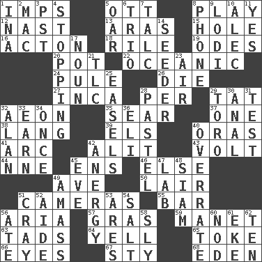 ACROSS 1. Naughty children 5. Baseball player Mel 8. Shaw product 12. Political cartoonist Thomas 13. Ancient river in northeast Turkey 15. Opening into or through something 16. NE Massachussets city 18. Cause heat under the collar 19. Lyric poems 20. Plant holder 22. Pertaining to the sea 24. Whimper 26. Expire 27. South American Indian 28. For each 29. Make lace 32. A really long time 35. Wither 37. Single 38. Long (Scottish) 39. Raised railways 40. Mouths or openings 41. Curve 42. Came down and settled, as after flight 43. Electrical Unit 44. Compass dir. 45. Followers of ems 46. Otherwise 49. "___ Maria" 50. Den 51. Devices for capturing images 55. Soap unit 56. Operatic vocal solo 57. Pate de foie ____ 59. French painter Edouard 63. Bits 64. Shout 65. Casino tip 66. Snake ____ (dice throw) 67. Filthy place 68. Genesis locale DOWN 1. _ tizzy (2 wds.) 2. Apple computer (short form) 3. Pacific Standard Time (abbr.) 4. Constricting 5. Rowing implement 6. Musical group of three 7. Baby powder 8. Give a jingle 9. Farming town in central California 10. Actor Baldwin 11. Affirmative reply 14. Sowing specialist 17. Part of speech 21. Affectionate concern, for short 23. Wind 25. Artist's stands 28. Soft color 29. "Corrida" creature 30. Of or related to the anus 31. Trial 32. ____ Jay Lerner 33. Merit 34. Single time 36. Biblical high priest 40. Make much ado about nothing 42. Disorder of the immune system 45. Night before a holiday 47. Experiment locale 48. Thailand, formerly 49. Collect or gather 51. Supercomputer manufacturer 52. Assistant 53. Ancient Greek god of war 54. Table seasoning 56. Had dinner 58. Wily 60. Allow head to fall sleepily 61. Supplement with great effort 62. "___ Little Indians"