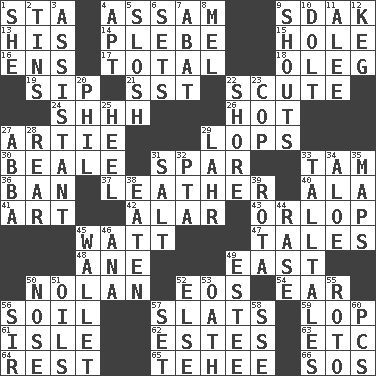 ACROSS 1. R.R. building 4. Indian state 9. Neighbor of Neb. 13. Part of HMS, perhaps 14. First-year military academy student 15. Opening into or through something 16. Followers of ems 17. Add up to 18. Cassini of fashion 19. Small drink 21. Fast jet (abbr.) 22. Snake scale 24. Quiet! 26. Being at a high temperature 27. Nick name for Arthur 29. Chops off 30. Calif. Air Force Base 31. Coast Guard woman 33. Scottish cap 36. Bar 37. Cordwainer's material 40. Wing 41. Nonscientific branch of learning 42. Having or resembling wings 43. Fourth or lowest deck 45. Electrical Unit 47. Falsehoods 48. One (Scot) 49. 90 degrees 50. Pitcher Ryan 52. Greek goddess of the dawn 54. Ewer handle 56. Land 57. Narrow boards 59. Trim (branches) 61. Capri or Wight 62. _____ Park, CO 63. And so on (abbr.) 64. Repose 65. Giggle 66. Distress signal DOWN 1. A female animal or person 2. Canisters 3. Helper 4. Fitting 5. Splash clumsily 6. Puts into a specified state 7. Blind as ____ 8. Cartoonist voice _ Blanc 9. Yells 10. Stupid person 11. Toward shelter 12. Cask 20. Silvers or Donahue 22. Dinah or Pauly 23. Police officer (slang) 25. The bottom of a shoe or boot 27. Swedish rock group 28. Buttocks 29. Cowardly lion portrayer 31. Table seasoning 32. Parent Teacher Association (abbr.) 33. Baron Munchausen's specialties 34. Medicinal plant 35. Atlas contents 38. Ingested 39. Roll call or roster of names 44. To erase 45. Place for singles 46. Santa ___, CA 49. First name in cosmetics 50. Olfactory organ 51. Lubricates 52. Otherwise 53. Pledge 55. Printing process, for short 56. Title for a knight 57. Arrange properly for use 58. Compass dir. 60. Personal Computers (abbr.)