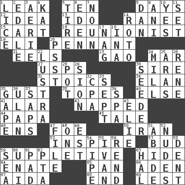 ACROSS 1. Path through which fluid escapes 5. Nine, plus one 8. 24-hour periods 12. The main thing one is thinking about 13. Wedding promise 14. Indian princess (variant) 15. Draw slowly or heavily 16. One who advocates reunion 19. Biblical high priest 20. Pre-World Series prize 21. Snakelike fish 23. E Mali city 24. Spoil 27. United States Postal Service (abbr.) 30. Beget 31. Unemotional ones 34. Style 35. Abrupt rush of wind 38. Drinks excessively 40. Otherwise 41. Having or resembling wings 42. Slept 44. Dad 45. Story 46. Followers of ems 47. Enemy 50. SW Asia republic 53. Motivate 57. Partially opened flower 59. Supplementary 63. Flintstone garb 64. Related on the mother's side 65. Baking dish 66. An important port of Yemen 67. Opera by Verdi 68. Conclusion 69. For fear that DOWN 1. Louse (plural) 2. Peak District village in England 3. Nest on high 4. Krazy ___ of comics 5. Hoop that covers a wheel 6. Paradise 7. Part of speech 8. One of the 12 tribes of Israel 9. Black tropical American cuckoo 10. It is so 11. Put into a specified state 14. Printing process, for short 17. Tired old horse 18. _ tizzy (2 wds.) 20. Inconspicuous attention getter 22. A period of five years 24. Place where flour is made 25. Ancient river in northeast Turkey 26. French philosopher Descartes 28. Plant holder 29. The Jewish people; Israel 30. Sowing specialist 32. Numbers guy (abbr.) 33. Back-to-school mo. 35. Open wide 36. ____ Bator, Mongolia 37. Plant excrements 39. Health resort 43. Writer Wiesel 47. Do some clerical work 48. Single 49. Eastern Standard Time (abbr.) 51. Tolerate 52. Unclothed pictures 54. Corncob 55. "Terrible" tsar 56. Tear apart 58. Incision 59. Ocean 60. Corn or form start 61. Groovy apt. 62. Parent Teacher Assoc. 63. Actor Linden