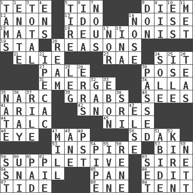 ACROSS 1. False hair 5. Metal container 8. South Vietnam president (1954) 12. At once, immediately (arch.) 13. Wedding promise 14. Annoying sound 15. Floor coverings 16. One who advocates reunion 19. R.R. building 20. Thinks logically 21. Writer Wiesel 23. Actress Charlotte 24. Be seated 27. Diluted with white 30. Airs 31. Develop 34. Silent film actress Nazimova 35. Drug cop 38. Catches 40. Observes 41. Operatic vocal solo 42. Sounds asleep 44. Baby powder 45. The longest river in the world 46. Sight organ 47. Atlas unit 50. Neighbor of Neb. 53. Motivate 57. Storage container 59. Supplementary 63. Male parent of an animal 64. Slow-paced one 65. Baking dish 66. Prepare for publication 67. Periodic rise and fall of the sea level 68. Compass dir. 69. Portable shelter DOWN 1. Scottish caps 2. Maternal 3. Add up to 4. Followers of ems 5. Become fatigued 6. The content of cognition 7. Horse sense 8. Spanish title 9. One more than two 10. Curvy letter 11. Was introduced to 14. Sense of smell 17. And not 18. _ tizzy (2 wds.) 20. 480, 500 or 516 sheets of paper 22. Medicinal drug used to evoke vomiting 24. Not divided or shared with others 25. Capri or Wight 26. Afternoon social gatherings 28. Part of a journey 29. Blunders 30. Went by 32. Separate the seeds from cotton 33. Inky black, to poets 35. Nathan's nickname 36. Like ___ of sunshine 37. Cause heat under the collar 39. _ Lanka 43. Otherwise 47. Place where flour is made 48. One (Scot) 49. Pacific Standard Time (abbr.) 51. Tolerate 52. Japanese brewing company 54. Corncob 55. _ the terrible 56. French philosopher Descartes 58. Remaining after all deductions 59. Fast jet (abbr.) 60. Corn or form start 61. Groovy apt. 62. Sliced dessert 63. Arrange properly for use
