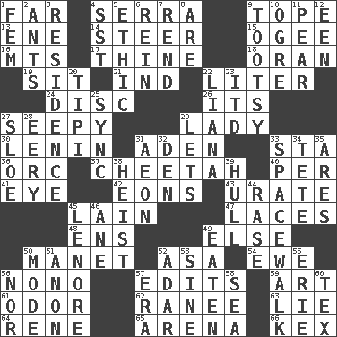 ACROSS 1. Distant 4. Father Junipero _ 9. Drink excessively 13. Compass dir. 14. Bull 15. Double curve, resembling the letter S 16. Mountains (abbr.) 17. One or ones belonging to thee 18. NW Algerian seaport 19. Be seated 21. Working for oneself (abbr.) 22. 61 cubic inches 24. Compact _ 26. ___ a Wonderful Life 27. Not well drained, as in land 29. Kenny Rogers chart-topper in '80 30. Soviet premier 1918-24 31. Arabian gulf 33. R.R. building 36. The grampus (Milton) 37. Leopard's kin 40. For each 41. Sight organ 42. Immeasurably long periods of time 43. A salt of uric acid 45. (Had) reclined 47. Shoestrings 48. Followers of ems 49. Otherwise 50. French painter Edouard 52. White ___ sheet 54. She-sheep 56. Words to Nanette 57. Proofreads 59. Tate display 61. Aroma 62. The wife of a rajah (variant) 63. Untruth 64. French philosopher Descartes 65. Sports stadium 66. A weed DOWN 1. Opposite of masc. 2. Pismires 3. Home 4. Fast jet (abbr.) 5. Value system 6. It's straight from the horse's mouth 7. Tear apart 8. "We ___ not amused" (Victoria) 9. Tootsie (variant) 10. Legendary monster 11. Lightbulb-shaped fruit 12. Car or cant ending 20. Native american tent (variation) 22. Climbing, woody, usually tropical vines 23. It would 25. Synchronize (abbr.) 27. A type of plum 28. Suggestive of the supernatural 29. Allows 31. Age 32. Lair 33. High altitude stroll 34. Wig 35. Ancient Greek god of war 38. Robbery 39. Frame or body of a ship 44. Raze (variant) 45. Poe poem 46. A saturated hydrocarbon 49. Consumed 50. Method 51. At once, immediately (arch.) 52. The sixth month of the Jewish calendar 53. Trig term 55. 4th largest of the Great Lakes 56. And not 57. Epoch 58. Ocean 60. John Ritter's dad