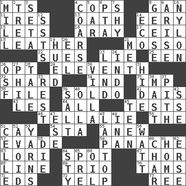 ACROSS 1. Mountains (abbr.) 4. 911 reaches them 8. Separate the seeds from cotton 11. Angers 13. Pledge 14. Suggestive of the supernatural 15. Allows 16. Like ___ of sunshine 17. To provide with a ceiling 18. Cordwainer's material 21. With motion or animation 22. Institutes legal proceedings 23. Untruth 25. Car or cant ending 26. Choose 29. Veterans Day date 32. Broken piece 34. Working for oneself (abbr.) 35. Mischievous child 38. Do some clerical work 39. Twentieth part of a lira 41. Raised platform 43. French article 44. Everything 45. Trials 46. Copy Pinocchio 50. Definite Article 51. Island 54. R.R. building 55. Afresh 57. Elude 59. Flamboyance 63. Australian parrot (variant) 64. Specific locale 67. Son of Odin 68. Actor's bit 69. Musical group of three 70. Scottish caps 71. Begley and Asner 72. Sharp bark 73. To sift DOWN 1. Place where flour is made 2. Relationship diagram 3. Bristle 4. Rough 5. Rowing implement 6. Parent Teacher Association (abbr.) 7. Like a shrinking violet 8. Honkers 9. Get up 10. Thermoplastic polyamide 12. Fast planes 14. Environmental prefix 19. Took on color 20. Snakelike fish 21. Was introduced to 23. Grant temporary use of 24. _ china 26. Order of Saint Francis (abbr.) 27. Silvers or Donahue 28. Lie 30. Country residence 31. Flintstone garb 33. Respite 36. Vertical spar for supporting sails 37. Essential or central part 39. Table seasoning 40. Rounded earthenware pot or jar 42. Compass dir. 45. Adolescent 47. Compass dir. 48. Portable computer 49. _ tizzy (2 wds.) 51. Cell (Danish) 52. Shun 53. Tall tales 56. Electrical Unit 58. Pass on 60. Burn to charcoal 61. Dwelling 62. Celtic language 64. Filthy place 65. Before (prefix) 66. Petroleum